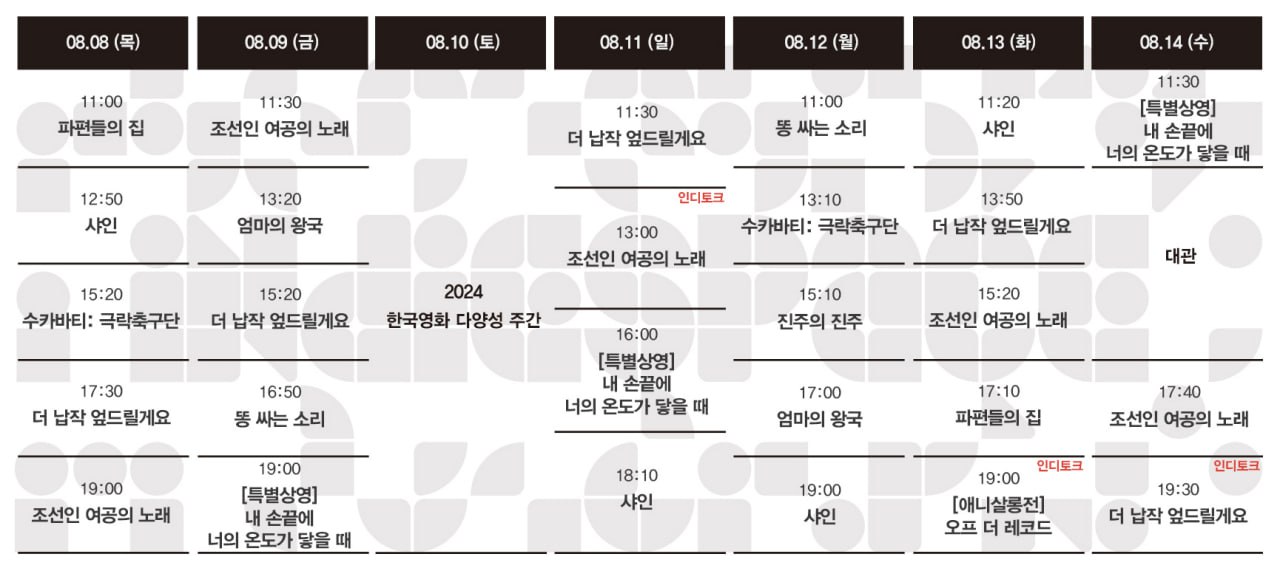 | 08.01-08.07 상영시간표 (0) | 2024.07.26 |