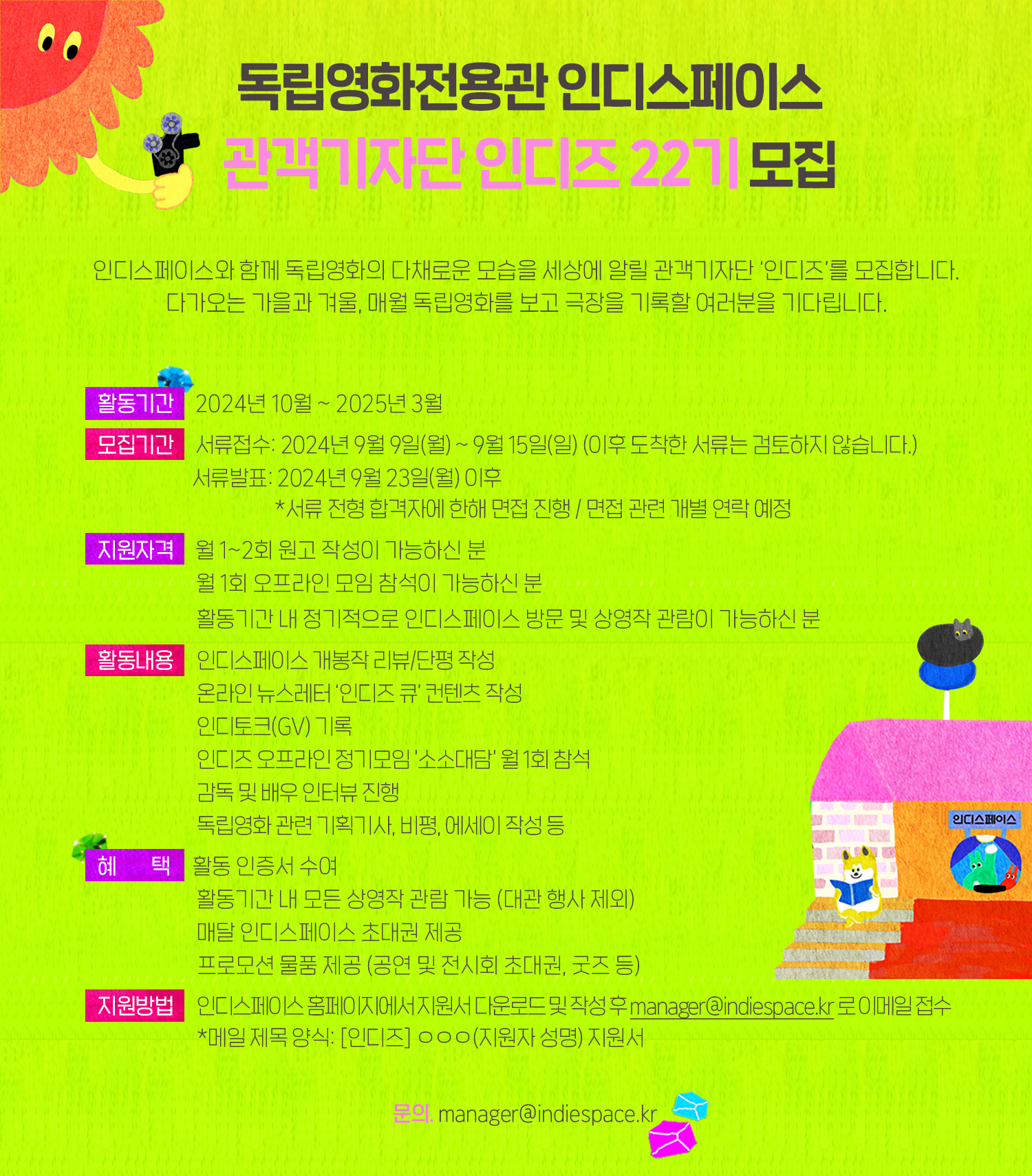 인디스페이스 홈페이지에서 지원서 다운로드 및 작성 후 manager@indiespace.kr 로 이메일 접수
