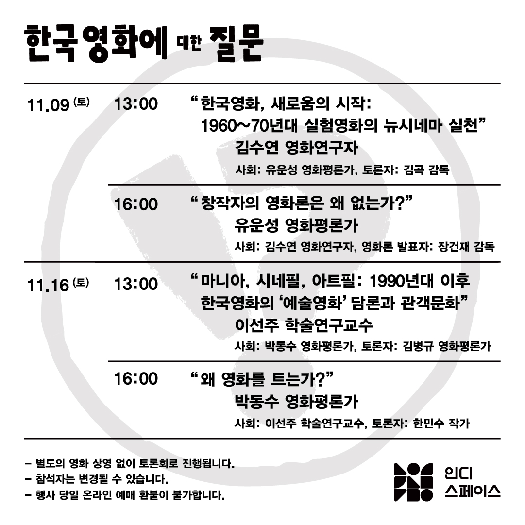 김수연, 박동수, 유운성, 이선주 등 네 명의 연구자·비평가와 함께 기획한 ‘한국영화에 대한 질문’은 우리나라의 비제도권 영화 문화가 어떻게 시작했으며 수용되어 왔는가를, 영화사적 관점에서, 창작자의 관점에서, 그리고 ‘예술영화’ 담론과 관객 문화, 그중에서도 ‘시네클럽’의 관점에서 탐구합니다.