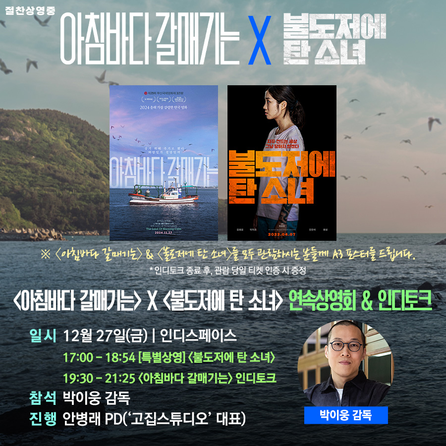 * <불도저에 탄 소녀> 당일 관람 티켓 소지 시 <아침바다 갈매기는> 인디토크 참석이 가능합니다. (<아침바다 갈매기는> 상영 후 입장)