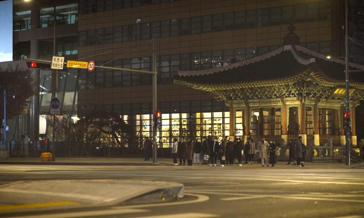 곽명동: 저는 ‘남자’가 갑자기, (관객석을 향해) 그렇죠, 그렇게 보셨죠? 누군가를 보고 내리는 거죠. 원래 목적지에서 내리는 게 아니에요. 광화문 소우에서 나와서 경기도 가는 어느 버스를 탔을 거예요? 타고 가는 도중에, 사대문 안을 벗어나기 전에, 누군가를 보고 내린 걸로 관객 입장에서는 그렇게 보입니다. 저는 내려서 또 그랬을 것 같아요. "잘못 내렸어요." 전전 여친에게 연락을 하지 않았을까? 저희가 농담 삼아서 아까 얘기 했던 거예요.저는 그렇게 해석하는 게 영화 보는 입장에서 맞는 것 같아요. 왜냐하면 그게 감독님께서 원하는 순환의 개념이잖아요. 계속 반복돼요.(관객석 웃음) 저 ‘남자’는 이 광화문이라는 시공간에서 계속 맴돌고 있는 걸로 받아들이면서. 영화 보는 방법이 여러 가지가 있겠지만 저는 그런 식으로 받아들이는 게 이 영화를 좀 더 온전하게 즐기는 게 아닐까 하고. 감독님께서 여러 가지를 매설해 놓으셨는데 그중에 하나가 방금 전 제가 보는 방식을 하나 매설해 놓았다고 저는 생각합니다.