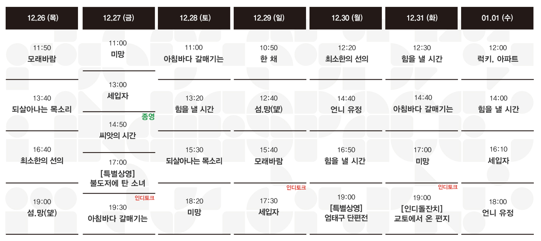 | 01.02-01.08 상영시간표 (0) | 2024.12.30 |