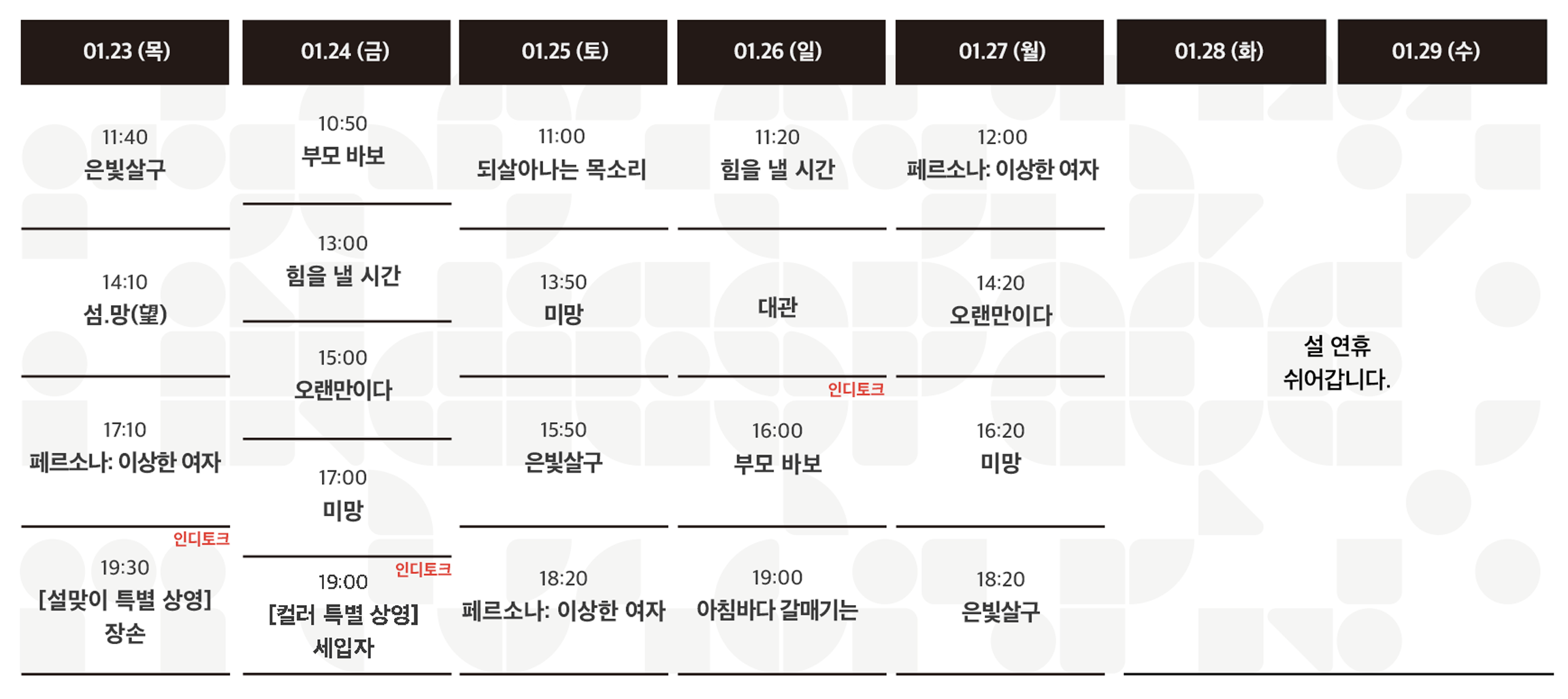 | 01.02-01.08 상영시간표 (0) | 2024.12.30 |