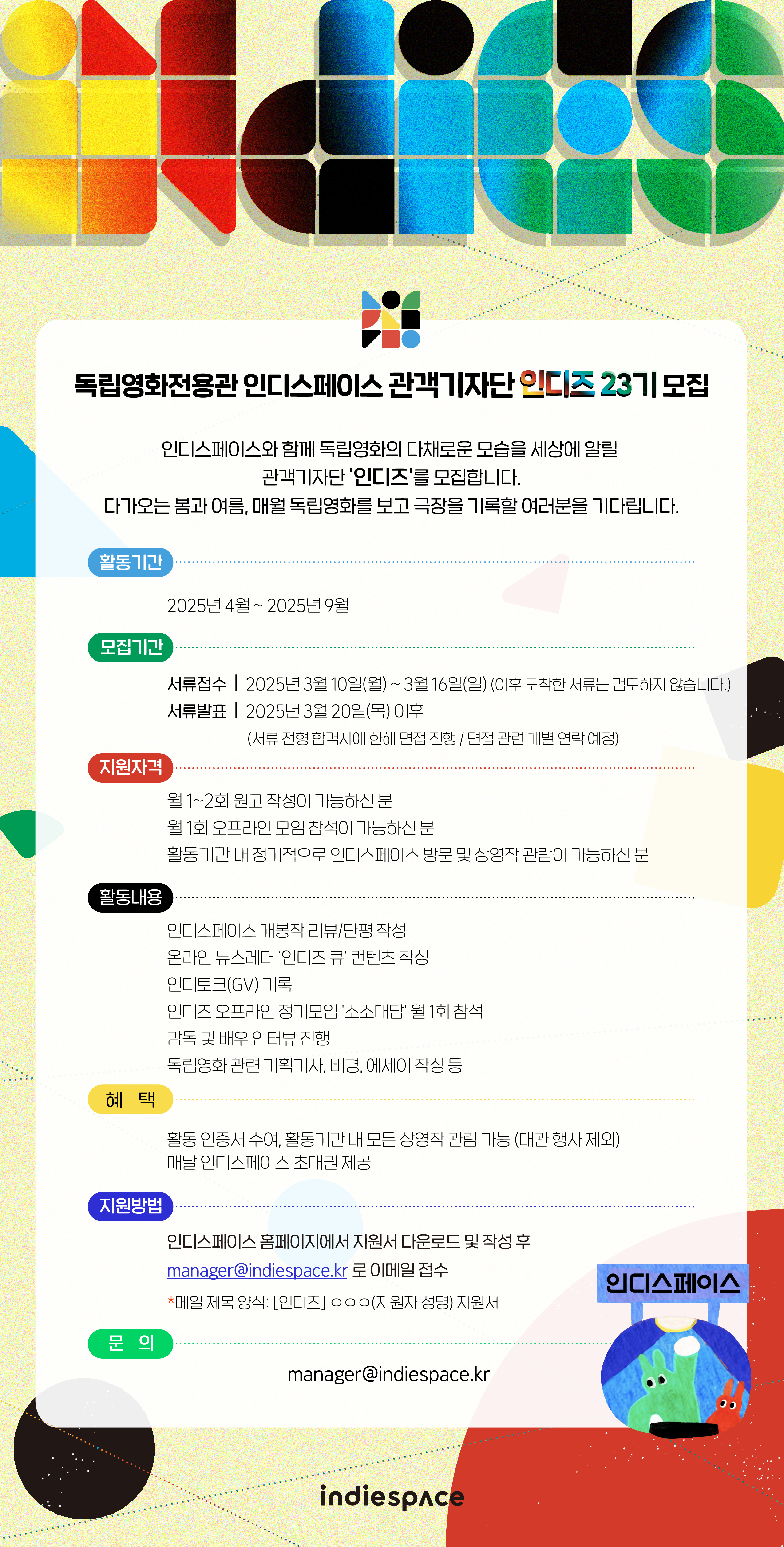 인디스페이스 홈페이지에서 지원서 다운로드 및 작성 후 manager@indiespace.kr 로 이메일 접수