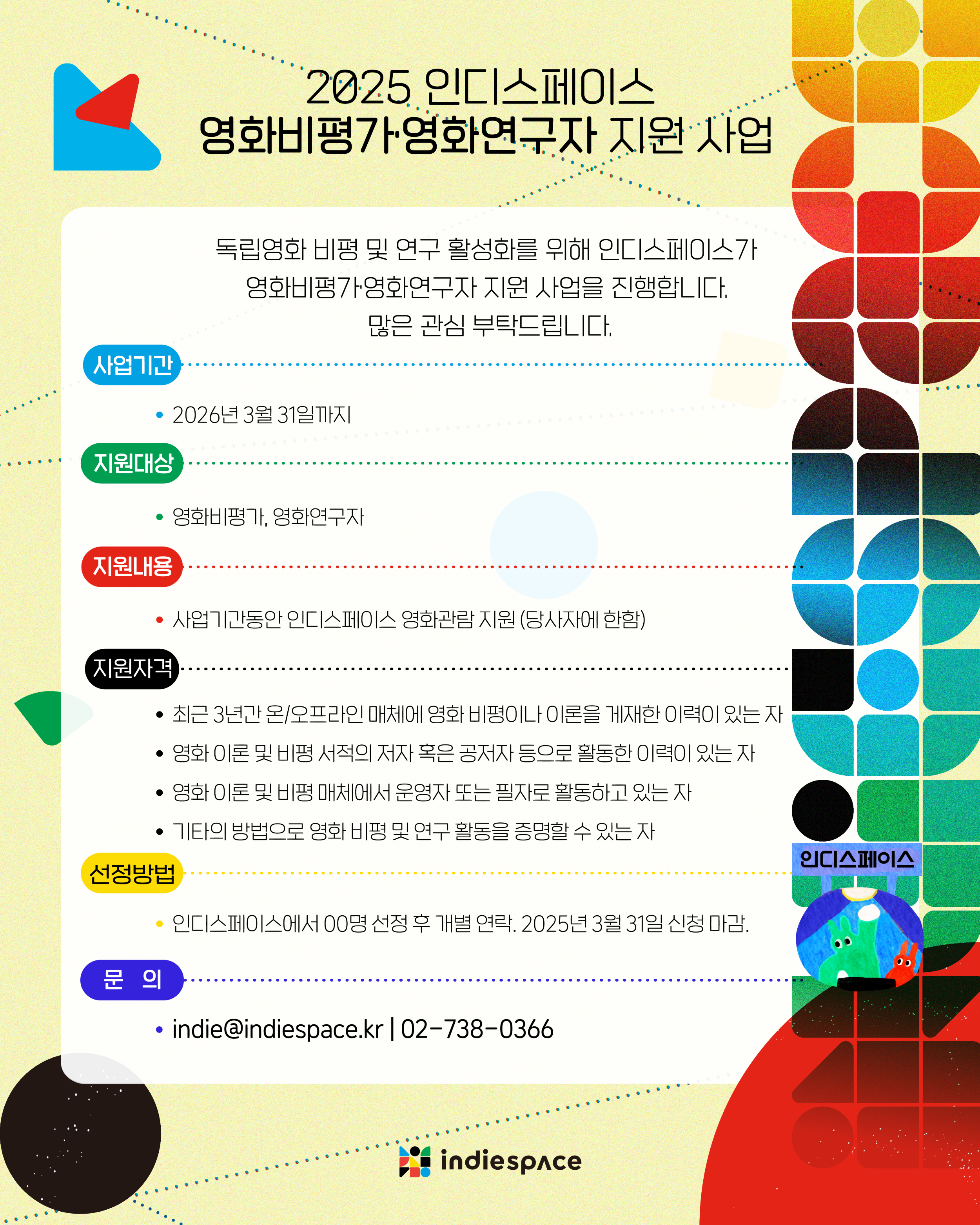 독립영화 비평 및 연구 활성화를 위해 인디스페이스가 영화비평가·영화연구자 지원 사업을 진행합니다. 많은 관심 부탁드립니다.