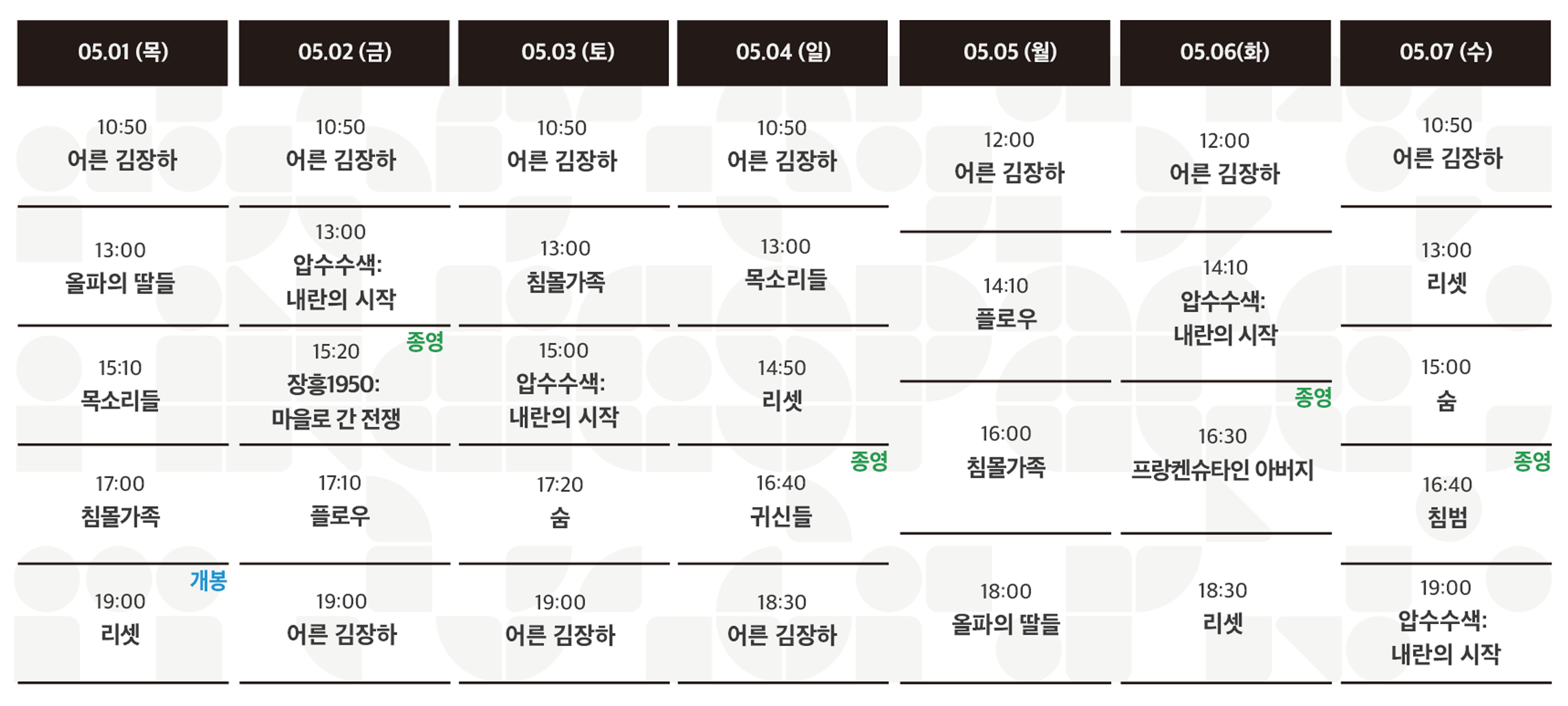 | 05.15-05.21 상영시간표 (0) | 2025.05.08 |