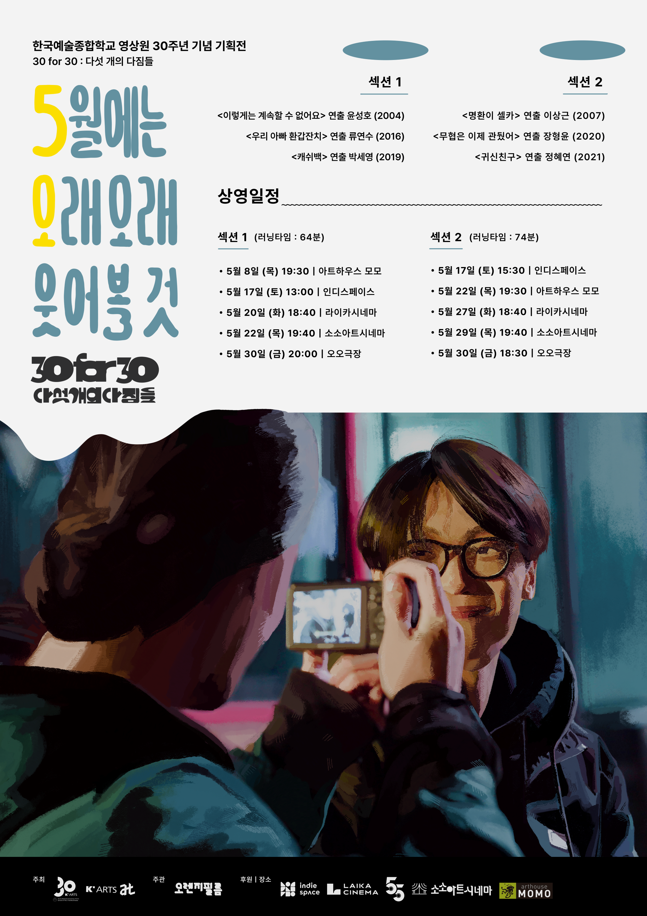 한국예술종합학교 영상원 30주년 기념 30편의 단편을 모아 '30 for 30: 다섯 개의 다짐들' 기획전을 마련했습니다. '다짐'이란 과거를 알고, 현재를 바라보며, 미래를 향해 나아가는 '시간'을 품은 단어입니다. 영화계와 관객을 놀라게 했던 영상원 작품들을 다섯 개의 다짐이란 주제로 만나는 이번 기획전을 통해 30편의 단편을 새롭게 바라보고, 동시에 다음에 있을 영상원의 작품들도 기대할 수 있는 자리가 되기를 바랍니다.