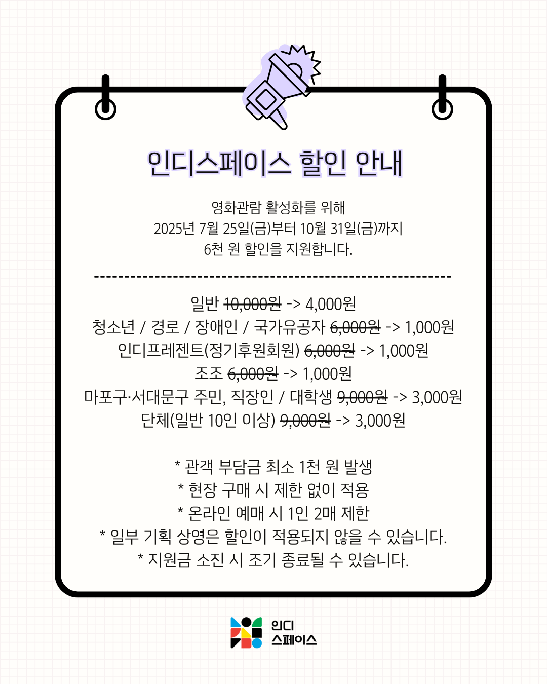 | [구인] 독립영화전용관 인디스페이스 시간제 근무자 모집 (0) | 2025.07.07 |