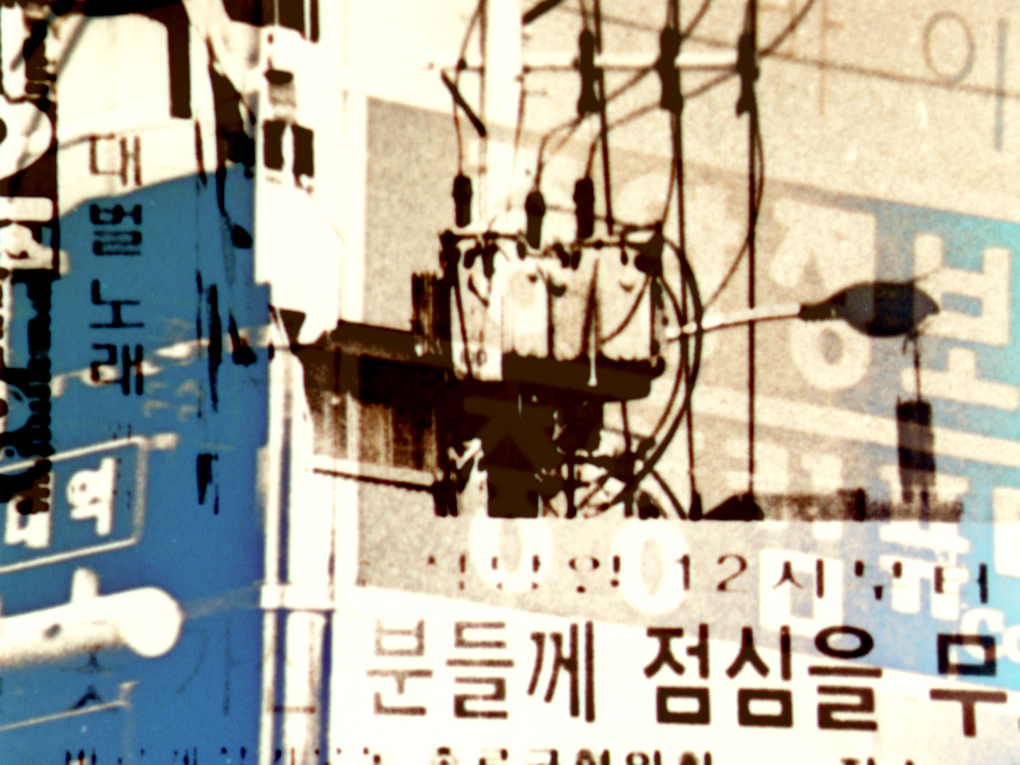 북아시아의 대도시. 굵은 거미줄처럼 드리워진 전선들이 거리 풍경을 장식한다. 폭발적인 색의 불꽃이 프레임에 전류가 흐르도록 만든다. 서울에서 흑백으로 촬영되었고, 현상 과정에서 컬러 손전등 빛을 사용하여 채색되었다.