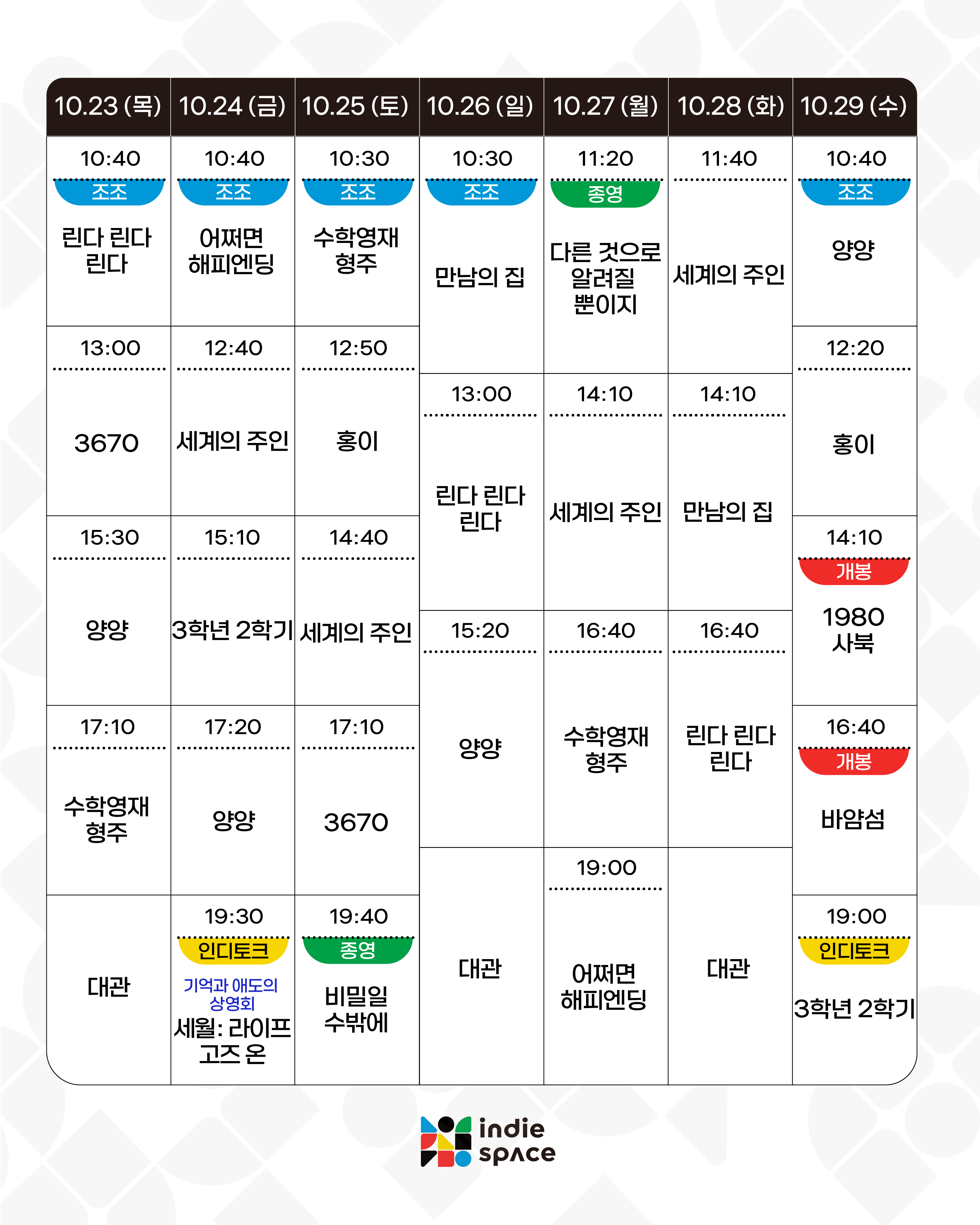 | 10.30-11.05 상영시간표 (0) | 2025.10.24 |