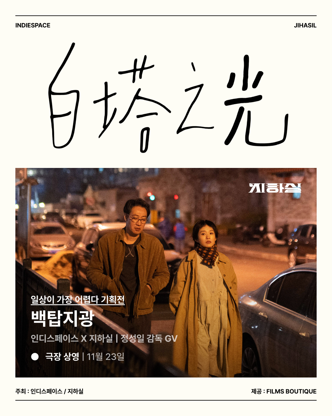 본 극장 상영은 인디스페이스 X 지하실 프로젝트 중 하나로 11월 1일부터 1월 31일까지 진행하는 기획전 '일상이 가장 어렵다'의 특별 스크리닝 행사입니다. 이에 재중동포 필름메이커이자 소설가인 장률의 중국 연출작 <백탑지광>을 선보입니다.