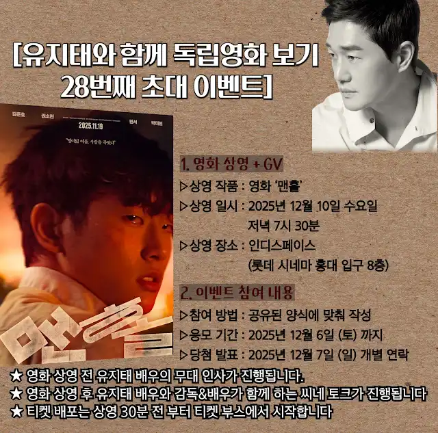 유지태 배우가 인디스페이스에서 <맨홀> 티켓 100장을 구매하여 관객 여러분을 초대합니다.