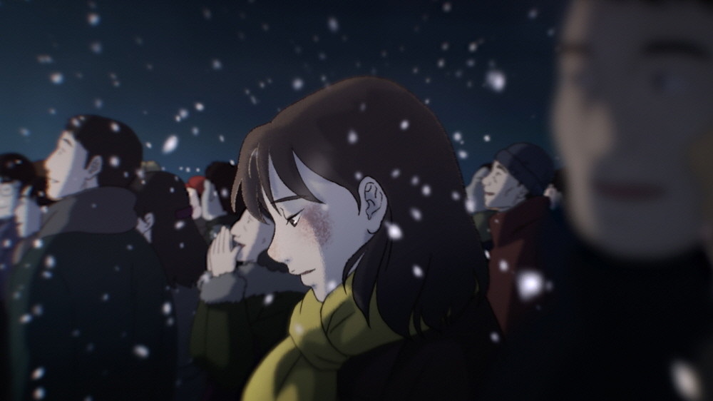 오유진: 〈광장〉에서만 가질 수 있는 룩을 획득하고 싶었어요. 저랑 감독님의 첫 장편 애니메이션이다 보니 〈광장〉이 앞으로 저희가 가져가야 할 정체성이라고 생각했고요. 흔히 보는 일본과 미국의 애니메이션에서 목격되는 것들을 피해 가기 위해 너무 정교하고 미끈한 느낌은 지양하려고 했습니다. 동시에 〈광장〉이 매우 추운 계절에 벌어지는 일인 만큼 습기 차고 거친 텍스처로 만들고 싶었어요. 그래서 실험도 되게 많이 해봤습니다. 선도 여러 번 그어보고, 모든 캐릭터를 대상으로 이것저것 대입해보고, 많이 연구하고 고민했어요. 정해진 예산 내에서 효율적이면서도, 집중할 수 있던 부분들이 있어 저희만의 룩을 찾을 수 있었던 거 같아요.