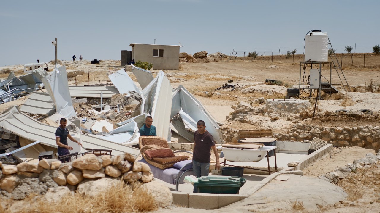 투쟁의 첫 겹은 팔레스타인의 ‘마사페레 야타’ 지역 거주민으로서 겪는 아픔이다. 하루아침에 집이 무너지고 학교가 사라진다. 노란 번호판의 이스라엘 차량은 자유롭게 달리지만, 녹색 번호판의 팔레스타인 차량은 서안 지구 너머로 갈 수 없다. 일상을 조금씩 갉아먹는 폭력에 지쳐 철거 명령에 응한다고 해도 마을 주민들이 갈 수 있는 곳은 팔레스타인 사람들을 모아둔 격리 구역에 가깝다. 그들에게 다른 땅은 있지만 없다.
