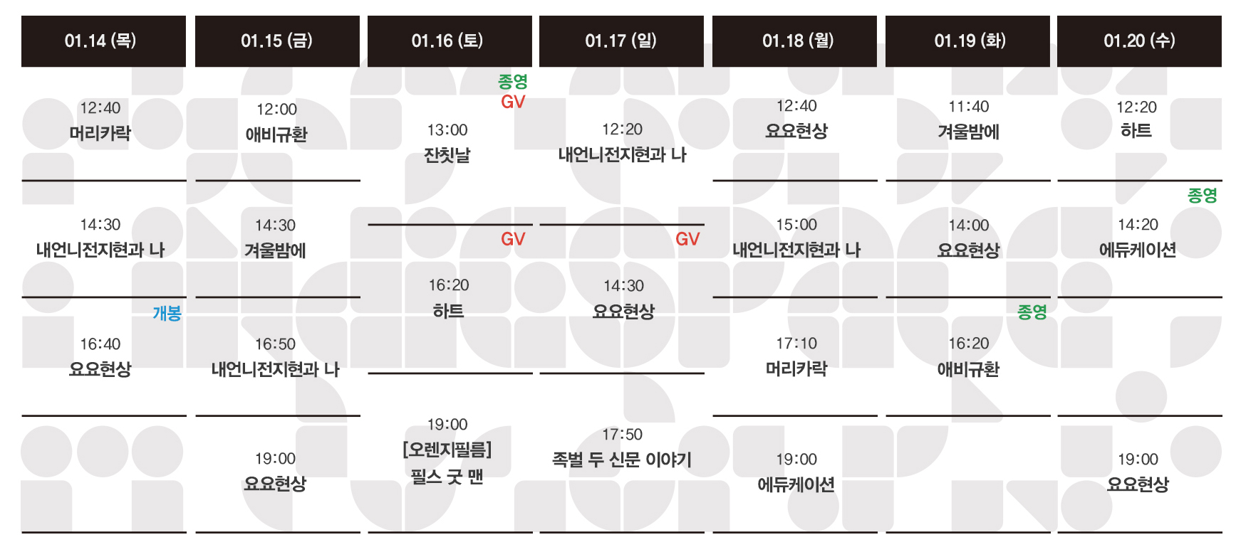 Now Playing/상영시간표 [01.14-01.20 상영시간표] 요요현상 / 하트 / 족벌 두 신문 이야기 / 머리카락 / 겨울밤에 / 잔칫날 / 에듀케이션 / 애비규환 by indiespace_은 2021. 1. 7. 예매하기 예스24 http://bit.ly/an5zh9 네이버 http://bit.ly/OVY1Mk 공유하기 게시글 관리 인디스페이스 indiespace 저작자표시 (새창열림) 'Now Playing > 상영시간표' 카테고리의 다른 글 [01.28-02.03 상영시간표] 나는 나를 해고하지 않는다 / 관계의 가나다에 있는 우리는 / 세자매 / 오늘, 우리2 / 요요현상 / 내언니전지현과 나 (0) 2021.01.22 [01.21-01.27 상영시간표] 오늘, 우리2 / 요요현상 / 하트 / 족벌 두 신문 이야기 / 머리카락 / 겨울밤에 / 내언니전지현과 나 (0) 2021.01.14 [01.07-01.13 상영시간표] 하트 / 족벌 두 신문 이야기 / 머리카락 / 겨울밤에 / 잔칫날 / 에듀케이션 / 애비규환 (0) 2021.01.04 [12.31-01.06 상영시간표] 하트 / 족벌 두 신문 이야기 / 머리카락 / 겨울밤에 / 잔칫날 / 에듀케이션 / 애비규환 / 남매의 여름밤 (0) 2020.12.28 [12.24-12.30 상영시간표] 머리카락 / 겨울밤에 / 잔칫날 / 럭키 몬스터 / 에듀케이션 / 애비규환 / 남매의 여름밤 (0) 2020.12.21 관련글 [01.28-02.03 상영시간표] 나는 나를 해고하지 않는다 / 관계의 가나다에 있는 우리는 / 세자매 / 오늘, 우리2 / 요요현상 / 내언니전지현과 나 [01.21-01.27 상영시간표] 오늘, 우리2 / 요요현상 / 하트 / 족벌 두 신문 이야기 / 머리카락 / 겨울밤에 / 내언니전지현과 나 [01.07-01.13 상영시간표] 하트 / 족벌 두 신문 이야기 / 머리카락 / 겨울밤에 / 잔칫날 / 에듀케이션 / 애비규환 [12.31-01.06 상영시간표] 하트 / 족벌 두 신문 이야기 / 머리카락 / 겨울밤에 / 잔칫날 / 에듀케이션 / 애비규환 / 남매의 여름밤 댓글