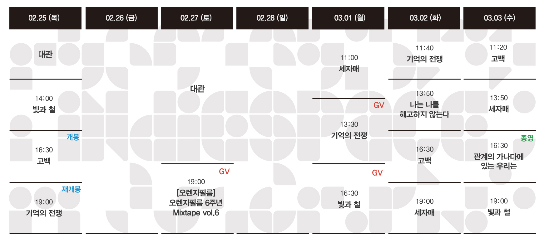 Now Playing/상영시간표 [02.25-03.03 상영시간표] 기억의 전쟁 / 고백 / 빛과 철 / 나는 나를 해고하지 않는다 / 관계의 가나다에 있는 우리는 / 세자매 by indiespace_은 2021. 2. 18. 예매하기 예스24 http://bit.ly/an5zh9 네이버 http://bit.ly/OVY1Mk 작품정보 고백 기억의 전쟁 빛과 철 나는 나를 해고하지 않는다 관계의 가나다에 있는 우리는 세자매 공유하기 게시글 관리 인디스페이스 indiespace 저작자표시 (새창열림) 'Now Playing > 상영시간표' 카테고리의 다른 글 [03.11-03.17 상영시간표] 밤빛 / 기억의 전쟁 / 고백 / 빛과 철 / 나는 나를 해고하지 않는다 / 세자매 (0) 2021.03.05 [03.04-03.10 상영시간표] 밤빛 / 기억의 전쟁 / 고백 / 빛과 철 / 나는 나를 해고하지 않는다 / 세자매 (0) 2021.02.25 [02.18-02.24 상영시간표] 빛과 철 / 나는 나를 해고하지 않는다 / 관계의 가나다에 있는 우리는 / 세자매 / 오늘, 우리2 / 요요현상 (0) 2021.02.15 [02.11-02.17 상영시간표] 나는 나를 해고하지 않는다 / 관계의 가나다에 있는 우리는 / 세자매 / 오늘, 우리2 / 요요현상 / 내언니전지현과 나 (0) 2021.02.05 [02.04-02.10 상영시간표] 나는 나를 해고하지 않는다 / 관계의 가나다에 있는 우리는 / 세자매 / 오늘, 우리2 / 요요현상 / 내언니전지현과 나 (0) 2021.01.28 관련글 [03.11-03.17 상영시간표] 밤빛 / 기억의 전쟁 / 고백 / 빛과 철 / 나는 나를 해고하지 않는다 / 세자매 [03.04-03.10 상영시간표] 밤빛 / 기억의 전쟁 / 고백 / 빛과 철 / 나는 나를 해고하지 않는다 / 세자매 [02.18-02.24 상영시간표] 빛과 철 / 나는 나를 해고하지 않는다 / 관계의 가나다에 있는 우리는 / 세자매 / 오늘, 우리2 / 요요현상 [02.11-02.17 상영시간표] 나는 나를 해고하지 않는다 / 관계의 가나다에 있는 우리는 / 세자매 / 오늘, 우리2 / 요요현상 / 내언니전지현과 나 댓글