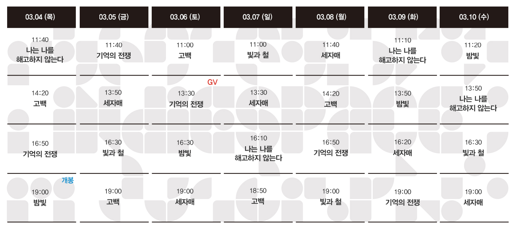 Now Playing/상영시간표 [03.04-03.10 상영시간표] 밤빛 / 기억의 전쟁 / 고백 / 빛과 철 / 나는 나를 해고하지 않는다 / 세자매 by indiespace_은 2021. 2. 25. 예매하기 예스24 http://bit.ly/an5zh9 네이버 http://bit.ly/OVY1Mk 작품정보 밤빛 고백 기억의 전쟁 빛과 철 나는 나를 해고하지 않는다 세자매 공유하기 게시글 관리 인디스페이스 indiespace 저작자표시 (새창열림) 'Now Playing > 상영시간표' 카테고리의 다른 글 [03.18-03.24 상영시간표] 정말 먼 곳 / 파이터 / 밤빛 / 기억의 전쟁 / 고백 / 빛과 철 / 세자매 (0) 2021.03.11 [03.11-03.17 상영시간표] 밤빛 / 기억의 전쟁 / 고백 / 빛과 철 / 나는 나를 해고하지 않는다 / 세자매 (0) 2021.03.05 [02.25-03.03 상영시간표] 기억의 전쟁 / 고백 / 빛과 철 / 나는 나를 해고하지 않는다 / 관계의 가나다에 있는 우리는 / 세자매 (0) 2021.02.18 [02.18-02.24 상영시간표] 빛과 철 / 나는 나를 해고하지 않는다 / 관계의 가나다에 있는 우리는 / 세자매 / 오늘, 우리2 / 요요현상 (0) 2021.02.15 [02.11-02.17 상영시간표] 나는 나를 해고하지 않는다 / 관계의 가나다에 있는 우리는 / 세자매 / 오늘, 우리2 / 요요현상 / 내언니전지현과 나 (0) 2021.02.05 관련글 [03.18-03.24 상영시간표] 정말 먼 곳 / 파이터 / 밤빛 / 기억의 전쟁 / 고백 / 빛과 철 / 세자매 [03.11-03.17 상영시간표] 밤빛 / 기억의 전쟁 / 고백 / 빛과 철 / 나는 나를 해고하지 않는다 / 세자매 [02.25-03.03 상영시간표] 기억의 전쟁 / 고백 / 빛과 철 / 나는 나를 해고하지 않는다 / 관계의 가나다에 있는 우리는 / 세자매 [02.18-02.24 상영시간표] 빛과 철 / 나는 나를 해고하지 않는다 / 관계의 가나다에 있는 우리는 / 세자매 / 오늘, 우리2 / 요요현상 댓글