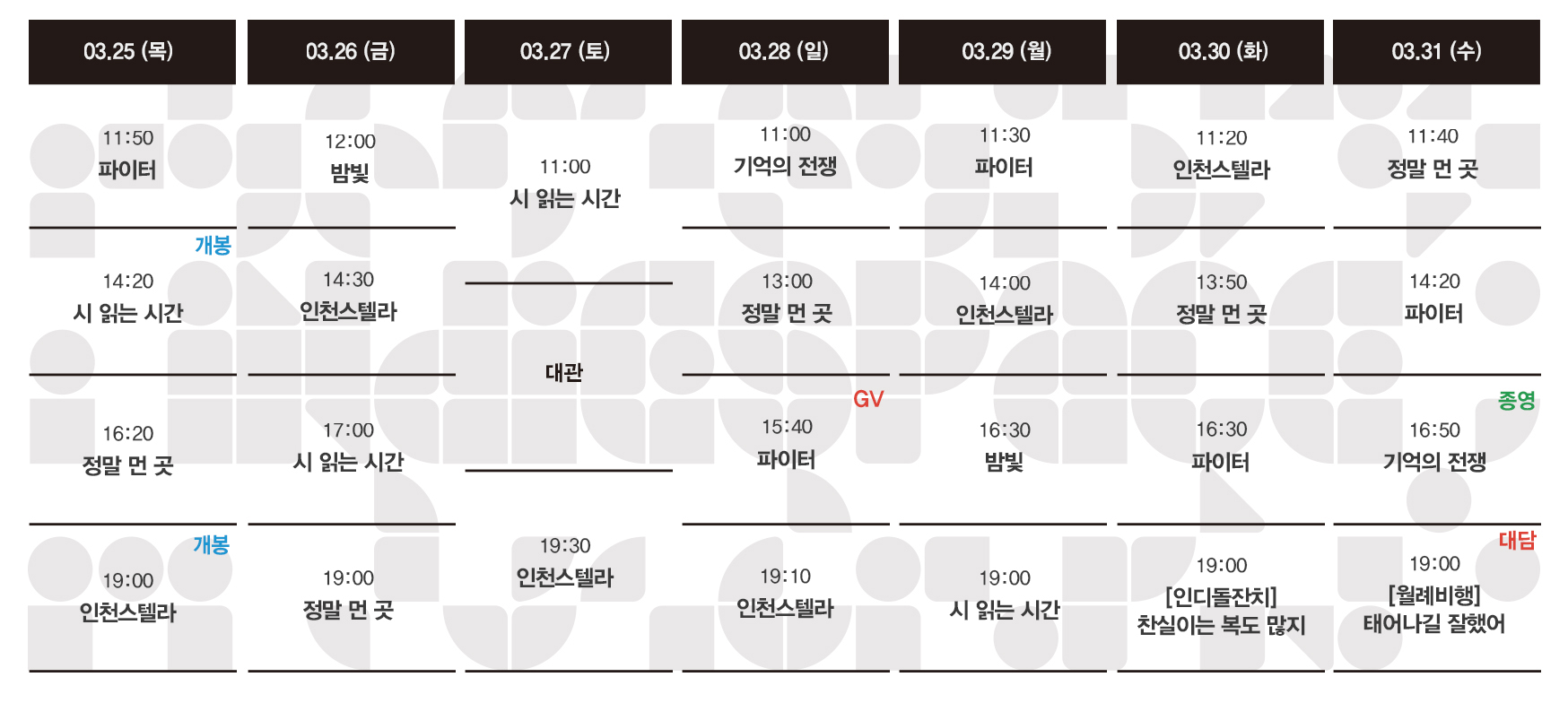 Now Playing/상영시간표 [03.25-03.31 상영시간표] 인천스텔라 / 시 읽는 시간 / 정말 먼 곳 / 파이터 / 밤빛 / 기억의 전쟁 by indiespace_은 2021. 3. 18. 예매하기 예스24 네이버 작품정보 인천스텔라 시 읽는 시간 정말 먼 곳 파이터 밤빛 기억의 전쟁 공유하기 게시글 관리 인디스페이스 indiespace 저작자표시 (새창열림) 'Now Playing > 상영시간표' 카테고리의 다른 글 [04.08-04.14 상영시간표] 비밀의 정원 / 더스트맨 / 당신의 사월 / 아무도 없는 곳 / 인천스텔라 / 시 읽는 시간 / 정말 먼 곳 / 파이터 (0) 2021.04.01 [04.01-04.07 상영시간표] 당신의 사월 / 아무도 없는 곳 / 인천스텔라 / 시 읽는 시간 / 정말 먼 곳 / 파이터 / 밤빛 / 빛과 철 (0) 2021.03.26 [03.18-03.24 상영시간표] 정말 먼 곳 / 파이터 / 밤빛 / 기억의 전쟁 / 고백 / 빛과 철 / 세자매 (0) 2021.03.11 [03.11-03.17 상영시간표] 밤빛 / 기억의 전쟁 / 고백 / 빛과 철 / 나는 나를 해고하지 않는다 / 세자매 (0) 2021.03.05 [03.04-03.10 상영시간표] 밤빛 / 기억의 전쟁 / 고백 / 빛과 철 / 나는 나를 해고하지 않는다 / 세자매 (0) 2021.02.25 관련글 [04.08-04.14 상영시간표] 비밀의 정원 / 더스트맨 / 당신의 사월 / 아무도 없는 곳 / 인천스텔라 / 시 읽는 시간 / 정말 먼 곳 / 파이터 [04.01-04.07 상영시간표] 당신의 사월 / 아무도 없는 곳 / 인천스텔라 / 시 읽는 시간 / 정말 먼 곳 / 파이터 / 밤빛 / 빛과 철 [03.18-03.24 상영시간표] 정말 먼 곳 / 파이터 / 밤빛 / 기억의 전쟁 / 고백 / 빛과 철 / 세자매 [03.11-03.17 상영시간표] 밤빛 / 기억의 전쟁 / 고백 / 빛과 철 / 나는 나를 해고하지 않는다 / 세자매 댓글
