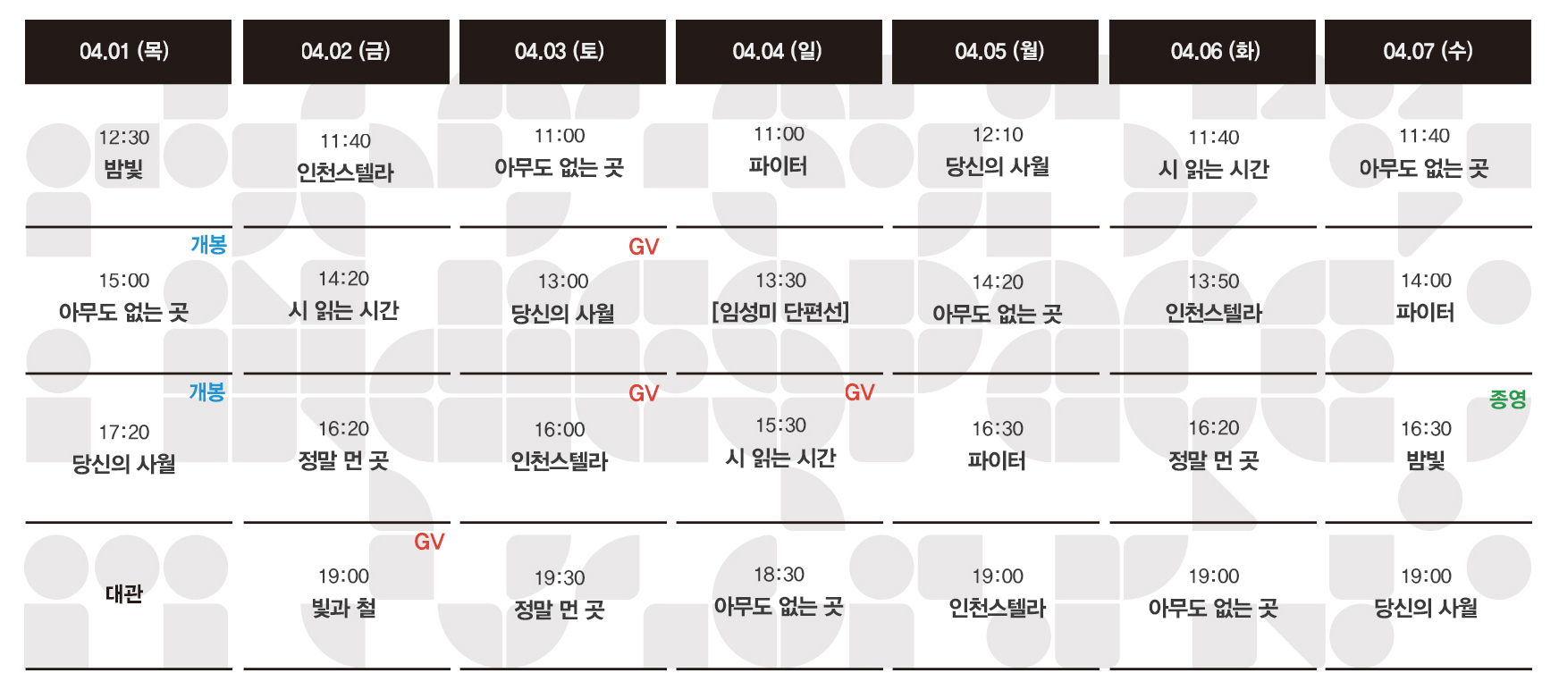 Now Playing/상영시간표 [04.01-04.07 상영시간표] 당신의 사월 / 아무도 없는 곳 / 인천스텔라 / 시 읽는 시간 / 정말 먼 곳 / 파이터 / 밤빛 / 빛과 철 by indiespace_은 2021. 3. 26. 예매하기 예스24 네이버 작품정보 당신의 사월 아무도 없는 곳 인천스텔라 시 읽는 시간 정말 먼 곳 파이터 밤빛 빛과 철 공유하기 게시글 관리 인디스페이스 indiespace 저작자표시 (새창열림) 'Now Playing > 상영시간표' 카테고리의 다른 글 [04.15-04.21 상영시간표] 어른들은 몰라요 / 비밀의 정원 / 더스트맨 / 당신의 사월 / 아무도 없는 곳 / 인천스텔라 / 시 읽는 시간 / 정말 먼 곳 / 파이터 (0) 2021.04.09 [04.08-04.14 상영시간표] 비밀의 정원 / 더스트맨 / 당신의 사월 / 아무도 없는 곳 / 인천스텔라 / 시 읽는 시간 / 정말 먼 곳 / 파이터 (0) 2021.04.01 [03.25-03.31 상영시간표] 인천스텔라 / 시 읽는 시간 / 정말 먼 곳 / 파이터 / 밤빛 / 기억의 전쟁 (0) 2021.03.18 [03.18-03.24 상영시간표] 정말 먼 곳 / 파이터 / 밤빛 / 기억의 전쟁 / 고백 / 빛과 철 / 세자매 (0) 2021.03.11 [03.11-03.17 상영시간표] 밤빛 / 기억의 전쟁 / 고백 / 빛과 철 / 나는 나를 해고하지 않는다 / 세자매 (0) 2021.03.05 관련글 [04.15-04.21 상영시간표] 어른들은 몰라요 / 비밀의 정원 / 더스트맨 / 당신의 사월 / 아무도 없는 곳 / 인천스텔라 / 시 읽는 시간 / 정말 먼 곳 / 파이터 [04.08-04.14 상영시간표] 비밀의 정원 / 더스트맨 / 당신의 사월 / 아무도 없는 곳 / 인천스텔라 / 시 읽는 시간 / 정말 먼 곳 / 파이터 [03.25-03.31 상영시간표] 인천스텔라 / 시 읽는 시간 / 정말 먼 곳 / 파이터 / 밤빛 / 기억의 전쟁 [03.18-03.24 상영시간표] 정말 먼 곳 / 파이터 / 밤빛 / 기억의 전쟁 / 고백 / 빛과 철 / 세자매 댓글