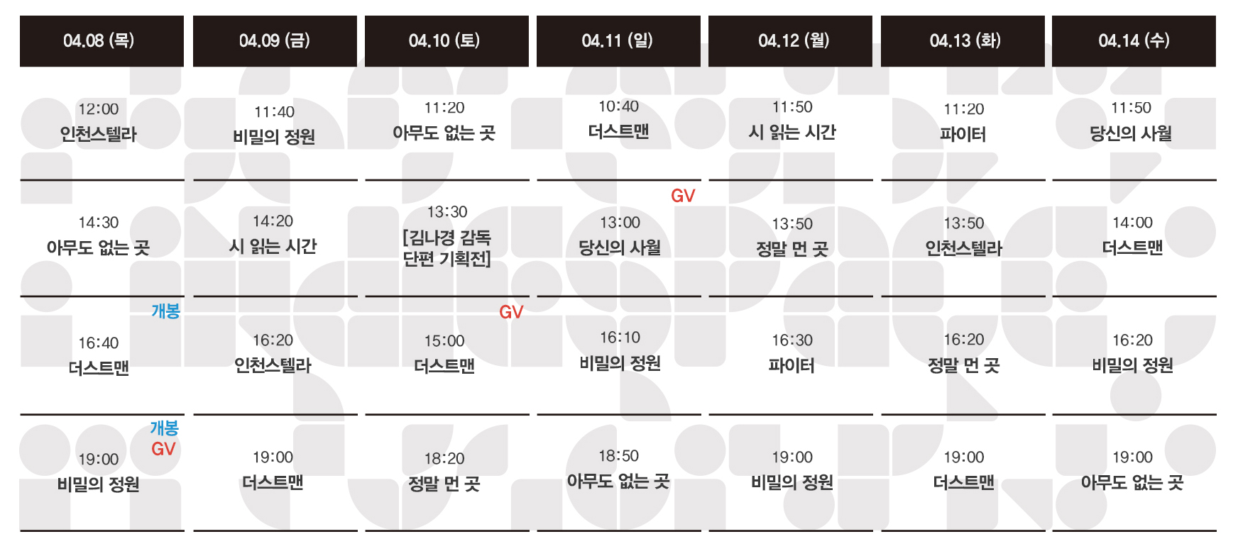 [04.08-04.14 상영시간표] 비밀의 정원 / 더스트맨 / 당신의 사월 / 아무도 없는 곳 / 인천스텔라 / 시 읽는 시간 / 정말 먼 곳 / 파이터