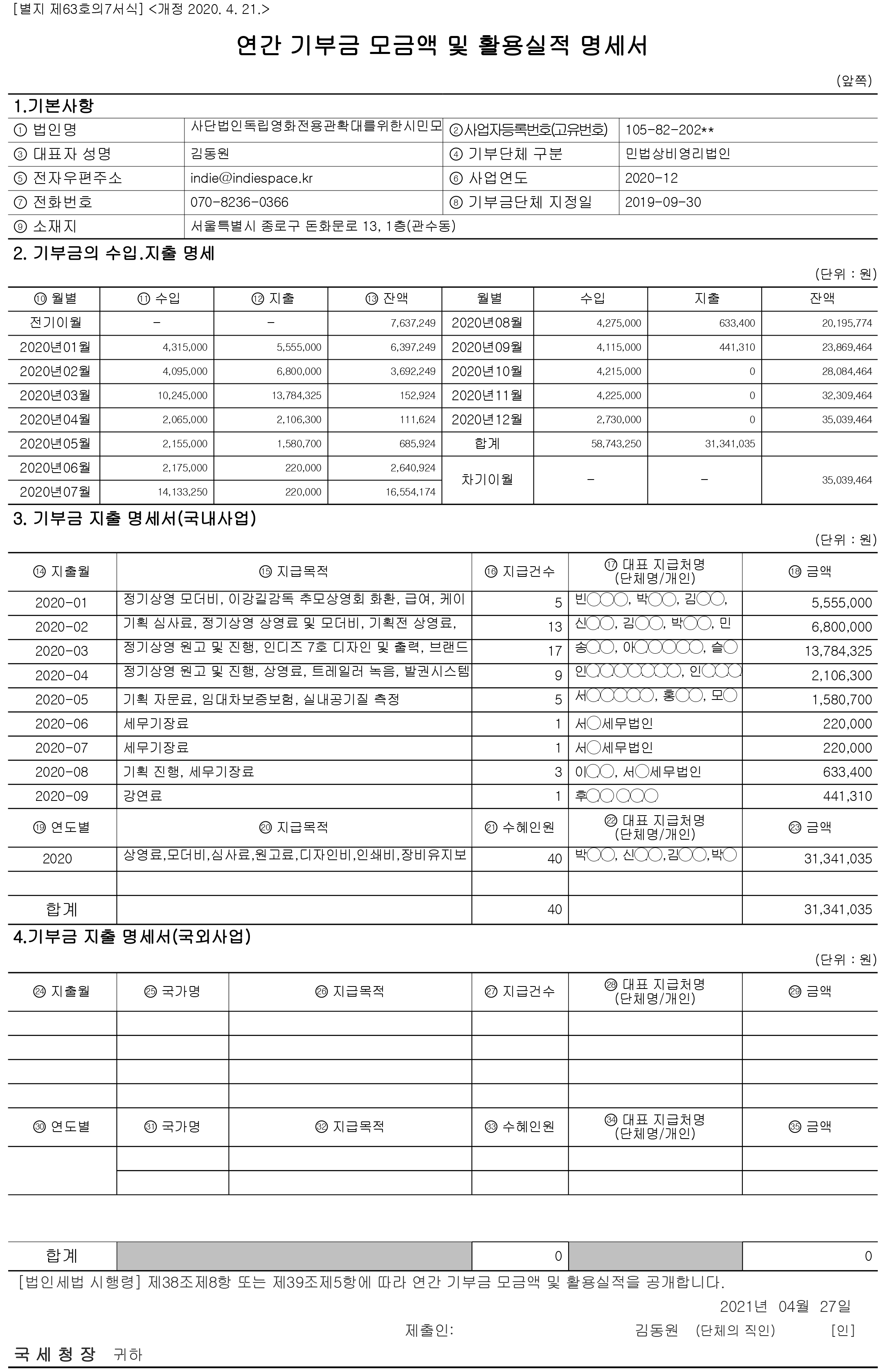 2020년 독립영화전용관 인디스페이스 기부금 내역