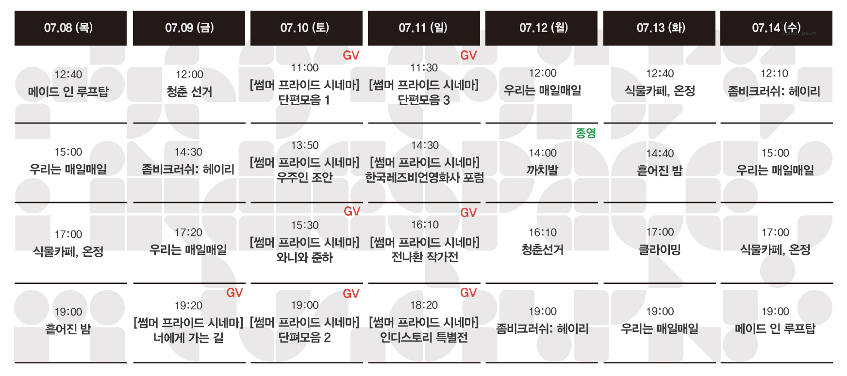 Now Playing/상영시간표 [07.08-07.14 상영시간표] 우리는 매일매일 / 좀비크러쉬: 헤이리 / 식물카페, 온정 / 흩어진 밤 / 메이드 인 루프탑 / 클라이밍 / 청춘 선거 / 까치발 by indiespace_은 2021. 7. 5. 예매하기 예스24 네이버 작품정보 좀비크러쉬: 헤이리 우리는 매일매일 식물카페, 온정 흩어진 밤 메이드 인 루프탑 클라이밍 청춘 선거 까치발 공유하기 게시글 관리 인디스페이스 indiespace 저작자표시 (새창열림) 'Now Playing > 상영시간표' 카테고리의 다른 글 [07.22-07.28 상영시간표] 빛나는 순간 / 액션히어로 / 우리는 매일매일 / 좀비크러쉬: 헤이리 / 식물카페, 온정 / 흩어진 밤 / 메이드 인 루프탑 (0) 2021.07.16 [07.15-07.21 상영시간표] 우리는 매일매일 / 좀비크러쉬: 헤이리 / 식물카페, 온정 / 흩어진 밤 / 메이드 인 루프탑 / 클라이밍 / 청춘 선거 (0) 2021.07.08 [07.01-07.07 상영시간표] 우리는 매일매일 / 좀비크러쉬: 헤이리 / 식물카페, 온정 / 흩어진 밤 / 메이드 인 루프탑 / 클라이밍 / 청춘 선거 / 까치발 (0) 2021.06.24 [06.24-06.30 상영시간표] 식물카페, 온정 / 흩어진 밤 / 메이드 인 루프탑 / 클라이밍 / 청춘 선거 / 낫아웃 / 까치발 (0) 2021.06.18 [06.17-06.23 상영시간표] 클라이밍 / 청춘 선거 / 낫아웃 / 까치발 / 인트로덕션 / 혼자 사는 사람들 / 학교 가는 길 (0) 2021.06.11 관련글 [07.22-07.28 상영시간표] 빛나는 순간 / 액션히어로 / 우리는 매일매일 / 좀비크러쉬: 헤이리 / 식물카페, 온정 / 흩어진 밤 / 메이드 인 루프탑 [07.15-07.21 상영시간표] 우리는 매일매일 / 좀비크러쉬: 헤이리 / 식물카페, 온정 / 흩어진 밤 / 메이드 인 루프탑 / 클라이밍 / 청춘 선거 [07.01-07.07 상영시간표] 우리는 매일매일 / 좀비크러쉬: 헤이리 / 식물카페, 온정 / 흩어진 밤 / 메이드 인 루프탑 / 클라이밍 / 청춘 선거 / 까치발 [06.24-06.30 상영시간표] 식물카페, 온정 / 흩어진 밤 / 메이드 인 루프탑 / 클라이밍 / 청춘 선거 / 낫아웃 / 까치발 댓글