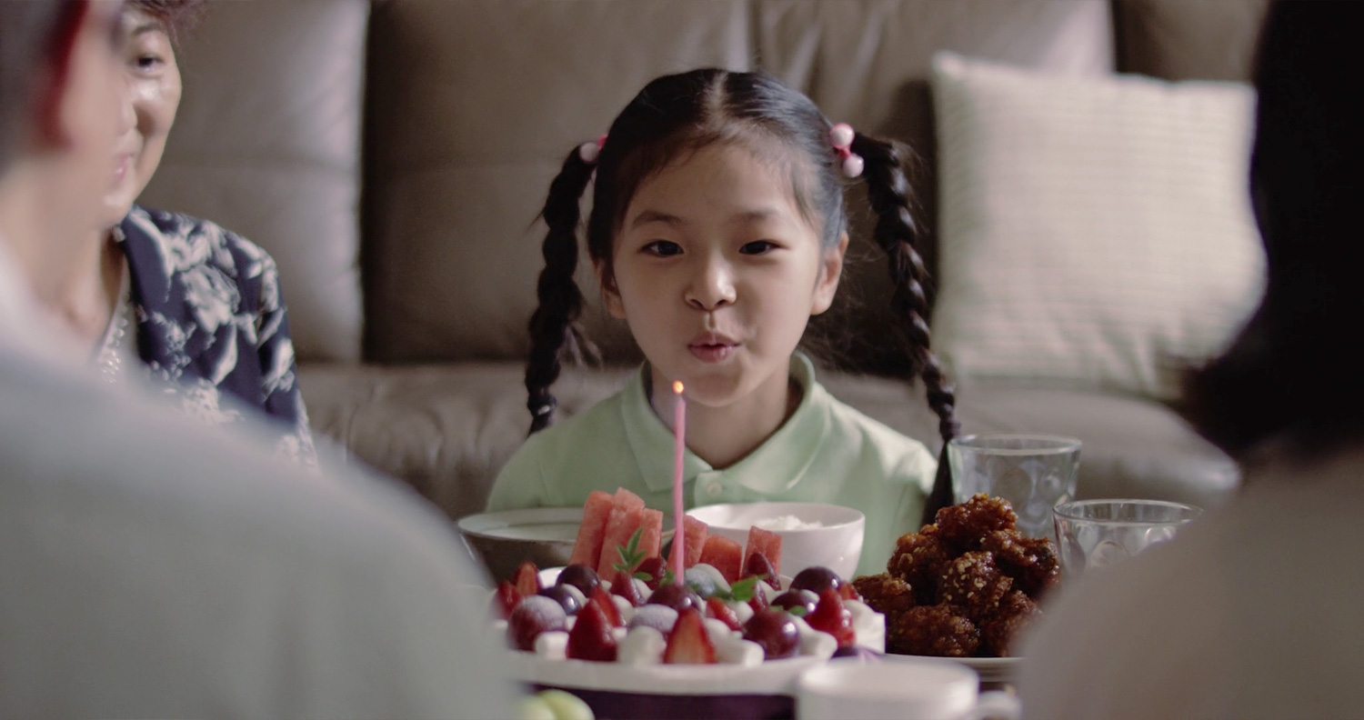김솔: 이 씬은 일부러 스타일리쉬하게끔 많이 보던 구도를 사용해보자 설정한 것이 맞고요. 처음에 풀 샷으로 세 사람이 나오고 수민이 편지를 엄마에게 건네 준 뒤 곧바로 수민의 얼굴로 들어가서 이 아이가 느끼는 것을 보여주자 설정을 했습니다. 수민이가 인형을 때리는 장면 같이 드론을 엄마, 아빠 사이로 날리는 장면도 저는 재미있는 장면이라고 생각했고요. 그걸 좀 더 강조하기 위해서 일부러 많이 보던 만화 같은 구성으로 콘티를 짰었습니다.