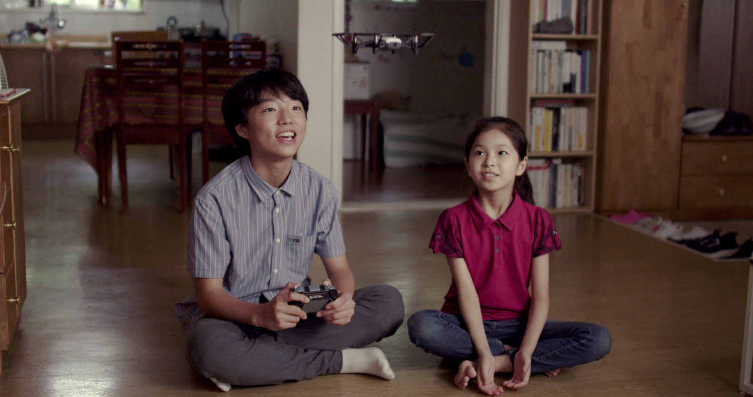 김솔: 처음에는 드론이 아니라 스케이트보드를 타는 씬들이 있었어요. 그런데 스케이트보드는 흔한 소재라는 생각이 들어 다른 놀이가 없을까 하다가 드론이 생각났어요. 영화가 즐거운 내용이 아니다 보니까 어떤 한 장면만큼은 아이들의 해맑은, 아무 걱정 없는 자유로운 모습이 담겼으면 좋겠다 생각해서 그 장면을 다른 장면과 다르게 연출하려고 했습니다.
