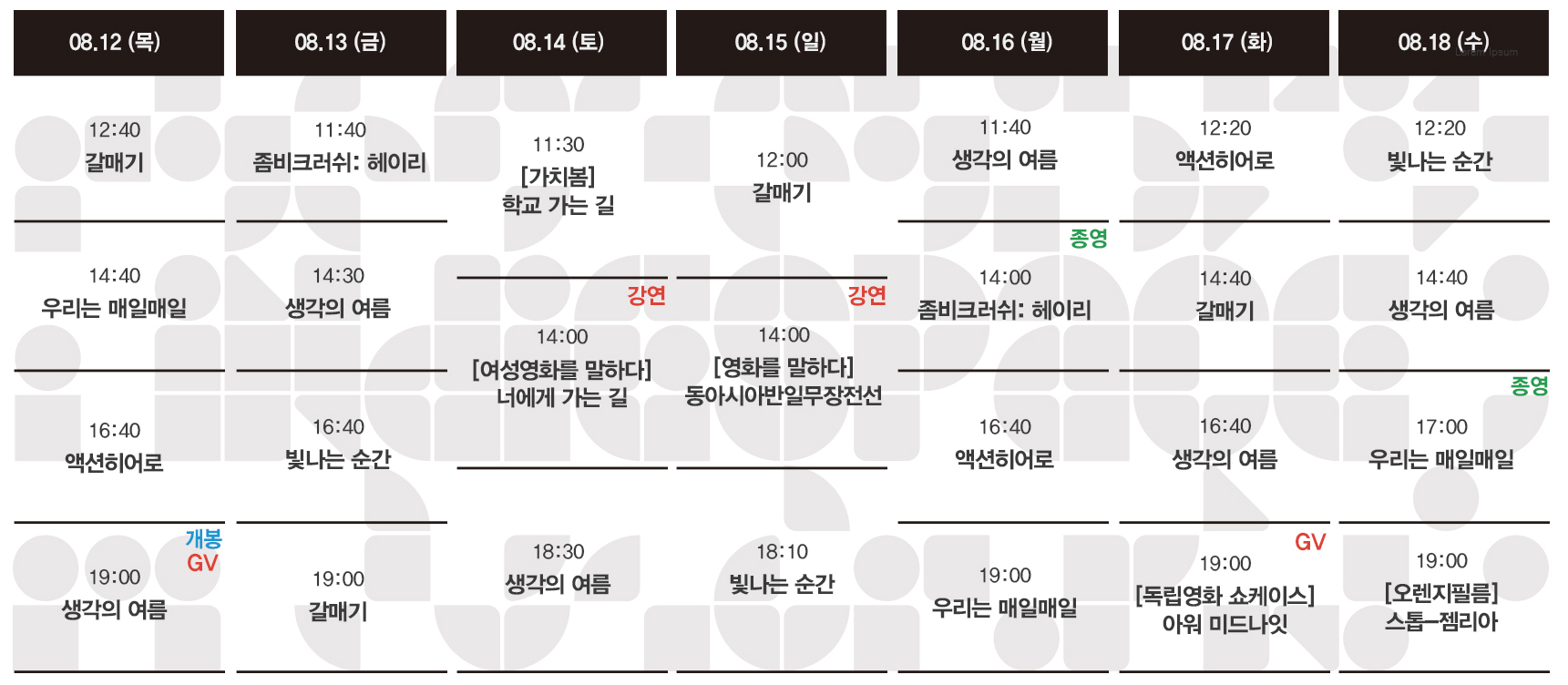 Now Playing/상영시간표 [08.12-08.18 상영시간표] 생각의 여름 / 갈매기 / 빛나는 순간 / 액션히어로 / 우리는 매일매일 / 좀비크러쉬: 헤이리 by indiespace_은 2021. 8. 5. 예매 예스24 개봉작 정보 생각의 여름 갈매기 빛나는 순간 액션히어로 우리는 매일매일 좀비크러쉬: 헤이리 메이드 인 루프탑 공유하기 게시글 관리 인디스페이스 indiespace 저작자표시 (새창열림) 'Now Playing > 상영시간표' 카테고리의 다른 글 [08.26-09.01 상영시간표] 최선의 삶 / 캐논볼 / 언더그라운드 / 박강아름 결혼하다 / 니키리라고도 알려진 / 생각의 여름 / 갈매기 / 학교 가는 길 (0) 2021.08.19 [08.19-08.25 상영시간표] 언더그라운드 / 박강아름 결혼하다 / 니키리라고도 알려진 / 생각의 여름 / 갈매기 / 빛나는 순간 / 액션히어로 / 학교 가는 길 (0) 2021.08.12 [08.04-08.11 상영시간표] 갈매기 / 빛나는 순간 / 액션히어로 / 우리는 매일매일 / 좀비크러쉬: 헤이리 / 메이드 인 루프탑 (0) 2021.07.29 [07.29-08.04 상영시간표] 갈매기 / 빛나는 순간 / 액션히어로 / 우리는 매일매일 / 좀비크러쉬: 헤이리 / 식물카페, 온정 / 메이드 인 루프탑 (0) 2021.07.23 [07.22-07.28 상영시간표] 빛나는 순간 / 액션히어로 / 우리는 매일매일 / 좀비크러쉬: 헤이리 / 식물카페, 온정 / 흩어진 밤 / 메이드 인 루프탑 (0) 2021.07.16 관련글 [08.26-09.01 상영시간표] 최선의 삶 / 캐논볼 / 언더그라운드 / 박강아름 결혼하다 / 니키리라고도 알려진 / 생각의 여름 / 갈매기 / 학교 가는 길 [08.19-08.25 상영시간표] 언더그라운드 / 박강아름 결혼하다 / 니키리라고도 알려진 / 생각의 여름 / 갈매기 / 빛나는 순간 / 액션히어로 / 학교 가는 길 [08.04-08.11 상영시간표] 갈매기 / 빛나는 순간 / 액션히어로 / 우리는 매일매일 / 좀비크러쉬: 헤이리 / 메이드 인 루프탑 [07.29-08.04 상영시간표] 갈매기 / 빛나는 순간 / 액션히어로 / 우리는 매일매일 / 좀비크러쉬: 헤이리 / 식물카페, 온정 / 메이드 인 루프탑 댓글