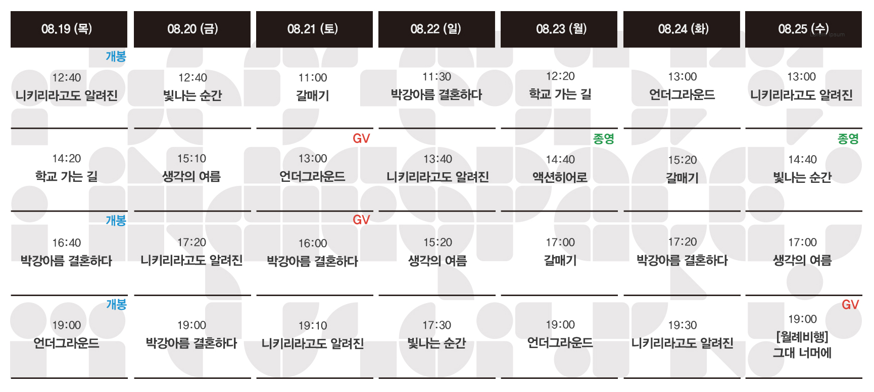 Now Playing/상영시간표 [08.19-08.25 상영시간표] 언더그라운드 / 박강아름 결혼하다 / 니키리라고도 알려진 / 생각의 여름 / 갈매기 / 빛나는 순간 / 액션히어로 / 학교 가는 길 by indiespace_은 2021. 8. 12. 예매 예스24 개봉작 정보 니키리라고도 알려진 박강아름 결혼하다 언더그라운드 생각의 여름 갈매기 액션히어로 빛나는 순간 공유하기 게시글 관리 인디스페이스 indiespace 저작자표시 (새창열림) 'Now Playing > 상영시간표' 카테고리의 다른 글 [09.02-09.08 상영시간표] 최선의 삶 / 캐논볼 / 언더그라운드 / 박강아름 결혼하다 / 니키리라고도 알려진 / 생각의 여름 / 갈매기 / 학교 가는 길 (0) 2021.08.27 [08.26-09.01 상영시간표] 최선의 삶 / 캐논볼 / 언더그라운드 / 박강아름 결혼하다 / 니키리라고도 알려진 / 생각의 여름 / 갈매기 / 학교 가는 길 (0) 2021.08.19 [08.12-08.18 상영시간표] 생각의 여름 / 갈매기 / 빛나는 순간 / 액션히어로 / 우리는 매일매일 / 좀비크러쉬: 헤이리 (0) 2021.08.05 [08.04-08.11 상영시간표] 갈매기 / 빛나는 순간 / 액션히어로 / 우리는 매일매일 / 좀비크러쉬: 헤이리 / 메이드 인 루프탑 (0) 2021.07.29 [07.29-08.04 상영시간표] 갈매기 / 빛나는 순간 / 액션히어로 / 우리는 매일매일 / 좀비크러쉬: 헤이리 / 식물카페, 온정 / 메이드 인 루프탑 (0) 2021.07.23 관련글 [09.02-09.08 상영시간표] 최선의 삶 / 캐논볼 / 언더그라운드 / 박강아름 결혼하다 / 니키리라고도 알려진 / 생각의 여름 / 갈매기 / 학교 가는 길 [08.26-09.01 상영시간표] 최선의 삶 / 캐논볼 / 언더그라운드 / 박강아름 결혼하다 / 니키리라고도 알려진 / 생각의 여름 / 갈매기 / 학교 가는 길 [08.12-08.18 상영시간표] 생각의 여름 / 갈매기 / 빛나는 순간 / 액션히어로 / 우리는 매일매일 / 좀비크러쉬: 헤이리 [08.04-08.11 상영시간표] 갈매기 / 빛나는 순간 / 액션히어로 / 우리는 매일매일 / 좀비크러쉬: 헤이리 / 메이드 인 루프탑 댓글