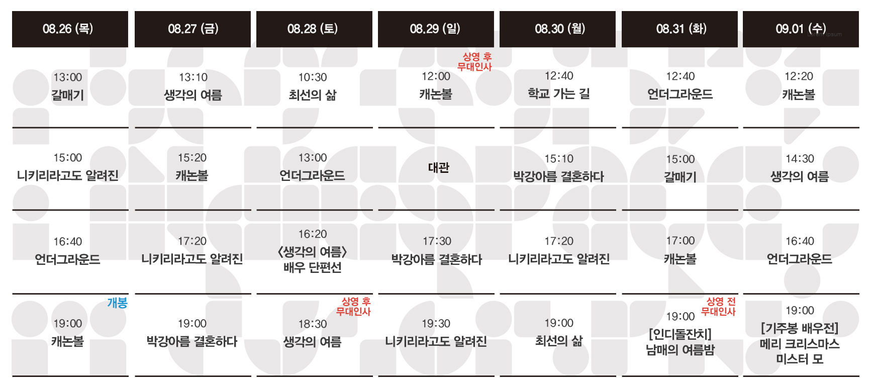 Now Playing/상영시간표 [08.26-09.01 상영시간표] 최선의 삶 / 캐논볼 / 언더그라운드 / 박강아름 결혼하다 / 니키리라고도 알려진 / 생각의 여름 / 갈매기 / 학교 가는 길 by indiespace_은 2021. 8. 19. 예매 예스24 개봉작 정보 최선의 삶 캐논볼 언더그라운드 박강아름 결혼하다 니키리라고도 알려진 생각의 여름 갈매기 학교 가는 길 개봉작 정보 공유하기 게시글 관리 인디스페이스 indiespace 저작자표시 (새창열림) 'Now Playing > 상영시간표' 카테고리의 다른 글 [09.09-09.15 상영시간표] 쇼미더고스트 / 좋은 사람 / 그대 너머에 / 생각의 여름 (0) 2021.09.02 [09.02-09.08 상영시간표] 최선의 삶 / 캐논볼 / 언더그라운드 / 박강아름 결혼하다 / 니키리라고도 알려진 / 생각의 여름 / 갈매기 / 학교 가는 길 (0) 2021.08.27 [08.19-08.25 상영시간표] 언더그라운드 / 박강아름 결혼하다 / 니키리라고도 알려진 / 생각의 여름 / 갈매기 / 빛나는 순간 / 액션히어로 / 학교 가는 길 (0) 2021.08.12 [08.12-08.18 상영시간표] 생각의 여름 / 갈매기 / 빛나는 순간 / 액션히어로 / 우리는 매일매일 / 좀비크러쉬: 헤이리 (0) 2021.08.05 [08.04-08.11 상영시간표] 갈매기 / 빛나는 순간 / 액션히어로 / 우리는 매일매일 / 좀비크러쉬: 헤이리 / 메이드 인 루프탑 (0) 2021.07.29 관련글 [09.09-09.15 상영시간표] 쇼미더고스트 / 좋은 사람 / 그대 너머에 / 생각의 여름 [09.02-09.08 상영시간표] 최선의 삶 / 캐논볼 / 언더그라운드 / 박강아름 결혼하다 / 니키리라고도 알려진 / 생각의 여름 / 갈매기 / 학교 가는 길 [08.19-08.25 상영시간표] 언더그라운드 / 박강아름 결혼하다 / 니키리라고도 알려진 / 생각의 여름 / 갈매기 / 빛나는 순간 / 액션히어로 / 학교 가는 길 [08.12-08.18 상영시간표] 생각의 여름 / 갈매기 / 빛나는 순간 / 액션히어로 / 우리는 매일매일 / 좀비크러쉬: 헤이리 댓글