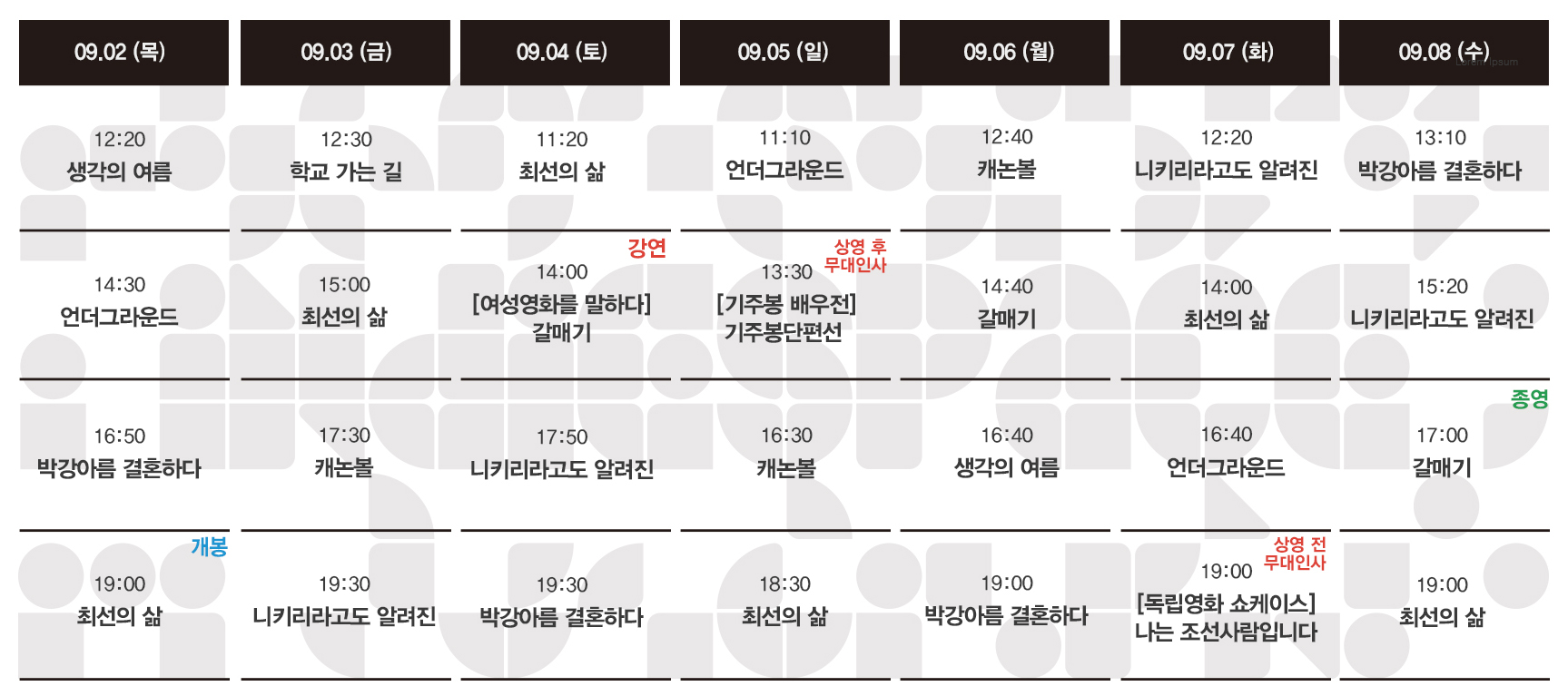 Now Playing/상영시간표 [09.02-09.08 상영시간표] 최선의 삶 / 캐논볼 / 언더그라운드 / 박강아름 결혼하다 / 니키리라고도 알려진 / 생각의 여름 / 갈매기 / 학교 가는 길 by indiespace_은 2021. 8. 27. 예매 예스24 개봉작 정보 최선의 삶 캐논볼 언더그라운드 박강아름 결혼하다 니키리라고도 알려진 생각의 여름 갈매기 학교 가는 길 공유하기 게시글 관리 인디스페이스 indiespace 저작자표시 (새창열림) 'Now Playing > 상영시간표' 카테고리의 다른 글 [09.16-09.22 상영시간표] 영화의 거리 / 쇼미더고스트 / 좋은 사람 / 그대 너머에 / 최선의 삶 / 캐논볼 / 언더그라운드 / 박강아름 결혼하다 / 니키리라고도 알려진 (0) 2021.09.10 [09.09-09.15 상영시간표] 쇼미더고스트 / 좋은 사람 / 그대 너머에 / 생각의 여름 (0) 2021.09.02 [08.26-09.01 상영시간표] 최선의 삶 / 캐논볼 / 언더그라운드 / 박강아름 결혼하다 / 니키리라고도 알려진 / 생각의 여름 / 갈매기 / 학교 가는 길 (0) 2021.08.19 [08.19-08.25 상영시간표] 언더그라운드 / 박강아름 결혼하다 / 니키리라고도 알려진 / 생각의 여름 / 갈매기 / 빛나는 순간 / 액션히어로 / 학교 가는 길 (0) 2021.08.12 [08.12-08.18 상영시간표] 생각의 여름 / 갈매기 / 빛나는 순간 / 액션히어로 / 우리는 매일매일 / 좀비크러쉬: 헤이리 (0) 2021.08.05 관련글 [09.16-09.22 상영시간표] 영화의 거리 / 쇼미더고스트 / 좋은 사람 / 그대 너머에 / 최선의 삶 / 캐논볼 / 언더그라운드 / 박강아름 결혼하다 / 니키리라고도 알려진 [09.09-09.15 상영시간표] 쇼미더고스트 / 좋은 사람 / 그대 너머에 / 생각의 여름 [08.26-09.01 상영시간표] 최선의 삶 / 캐논볼 / 언더그라운드 / 박강아름 결혼하다 / 니키리라고도 알려진 / 생각의 여름 / 갈매기 / 학교 가는 길 [08.19-08.25 상영시간표] 언더그라운드 / 박강아름 결혼하다 / 니키리라고도 알려진 / 생각의 여름 / 갈매기 / 빛나는 순간 / 액션히어로 / 학교 가는 길 댓글