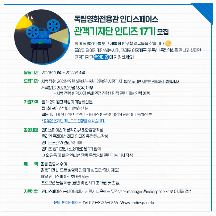 독립영화전용관 인디스페이스 관객기자단 인디즈 16기 모집