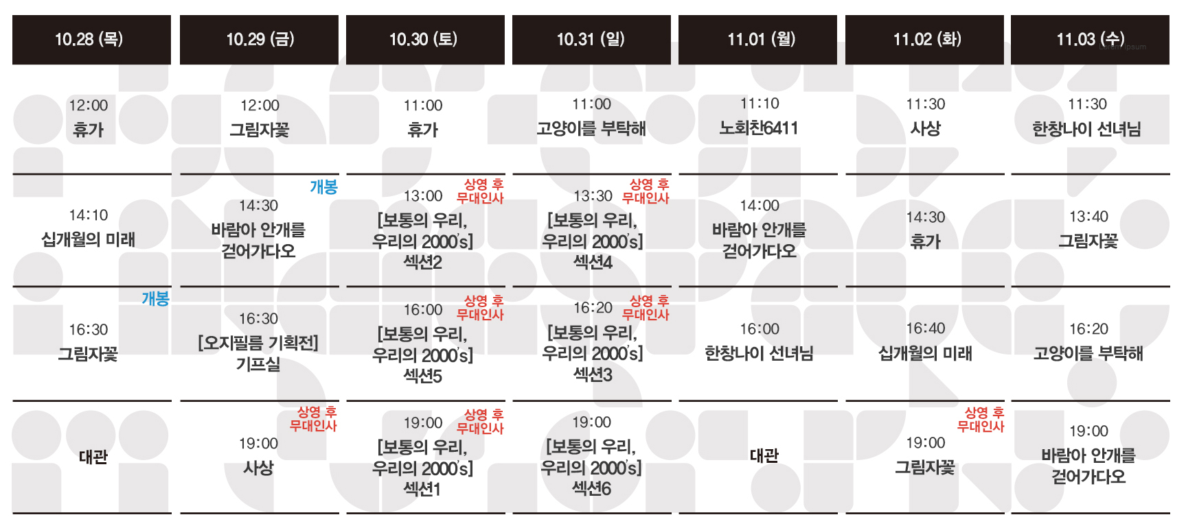 Now Playing/상영시간표 [10.28-11.03 상영시간표] 바람아 안개를 걷어가다오 / 그림자꽃 / 휴가 / 한창나이 선녀님 / 사상 / 십개월의 미래 / 노회찬6411 / 고양이를 부탁해 by indiespace_은 2021. 10. 22. 예매 예스24 상영작 정보 십개월의 미래 노회찬6411고양이를 부탁해휴가 한창나이 선녀님 바람아 안개를 걷어가다오 사상 +무대인사 그림자꽃 +무대인사 [기획전] 보통의 우리, 우리의 2000's 공유하기 게시글 관리 인디스페이스 indiespace 저작자표시 (새창열림) 'Now Playing > 상영시간표' 카테고리의 다른 글 [11.11-11.17 상영시간표] 왕십리 김종분 / 아워 미드나잇 / 당신얼굴 앞에서 / 바람아 안개를 걷어가다오 / 그림자꽃 / 휴가 / 사상 / 십개월의 미래 / 노회찬6411 / 고양이를 부탁해 (1) 2021.11.04 [11.04-11.10 상영시간표] 당신얼굴 앞에서 / 바람아 안개를 걷어가다오 / 그림자꽃 / 휴가 / 한창나이 선녀님 / 사상 / 십개월의 미래 / 노회찬6411 / 고양이를 부탁해 / 최선의 삶 (0) 2021.10.28 [10.21-10.27 상영시간표] 휴가 / 한창나이 선녀님 / 사상 / 십개월의 미래 / 노회찬6411 / 고양이를 부탁해 / 종착역 / 최선의 삶 (0) 2021.10.15 [10.14-10.20 상영시간표] 십개월의 미래 / 노회찬6411 / 고양이를 부탁해 / 종착역 / 영화의 거리 / 그대 너머에 / 최선의 삶 (0) 2021.10.07 [10.07-10.13 상영시간표] 고양이를 부탁해 / 종착역 / 영화의 거리 / 쇼미더고스트 / 좋은 사람 / 그대 너머에 / 최선의 삶 / 언더그라운드 / 니키리라고도 알려진 (0) 2021.09.29 관련글 [11.11-11.17 상영시간표] 왕십리 김종분 / 아워 미드나잇 / 당신얼굴 앞에서 / 바람아 안개를 걷어가다오 / 그림자꽃 / 휴가 / 사상 / 십개월의 미래 / 노회찬6411 / 고양이를 부탁해 [11.04-11.10 상영시간표] 당신얼굴 앞에서 / 바람아 안개를 걷어가다오 / 그림자꽃 / 휴가 / 한창나이 선녀님 / 사상 / 십개월의 미래 / 노회찬6411 / 고양이를 부탁해 / 최선의 삶 [10.21-10.27 상영시간표] 휴가 / 한창나이 선녀님 / 사상 / 십개월의 미래 / 노회찬6411 / 고양이를 부탁해 / 종착역 / 최선의 삶 [10.14-10.20 상영시간표] 십개월의 미래 / 노회찬6411 / 고양이를 부탁해 / 종착역 / 영화의 거리 / 그대 너머에 / 최선의 삶 댓글