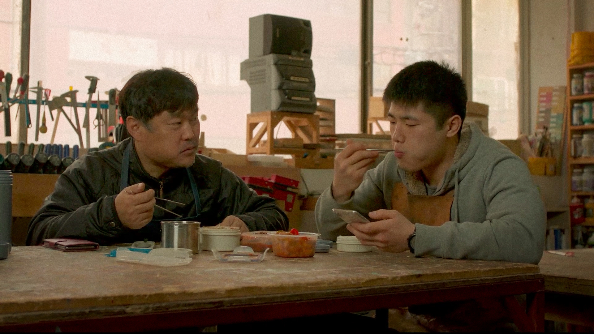 또한 밥은 재복과 사람들이 관계를 맺는 연결고리로 작용한다. 재복이 차려준 밥상을 거절하고 라면을 끓여 먹는 두 딸과 재복은 밥상머리를 맞대고 있지만 그 사이에는 휴대전화가 줄곧 존재한다. 일터에서 항상 에어팟을 끼고 일을 하는 청년. 재복이 준비해 온 밥을 함께 먹을 때에도 손에서 휴대전화를 놓지 않는다. 그럼에도 재복은 끊임없이 소통을 시도한다.