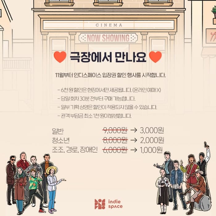 11월부터 인디스페이스 입장권 할인 행사를 시작합니다.