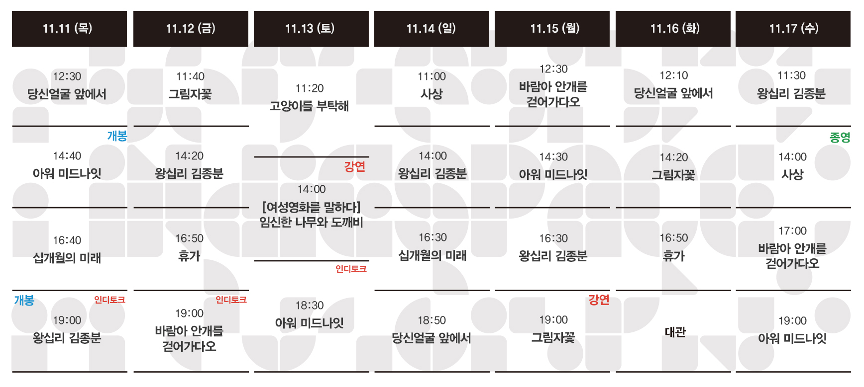 Now Playing/상영시간표 [11.11-11.17 상영시간표] 왕십리 김종분 / 아워 미드나잇 / 당신얼굴 앞에서 / 바람아 안개를 걷어가다오 / 그림자꽃 / 휴가 / 사상 / 십개월의 미래 / 노회찬6411 / 고양이를 부탁해 by indiespace_은 2021. 11. 4. 예매 예스24 상영작 정보 왕십리 김종분 아워 미드나잇 당신얼굴 앞에서 바람아 안개를 걷어가다오 그림자꽃 휴가 사상 십개월의 미래 노회찬6411 고양이를 부탁해 공유하기 게시글 관리 인디스페이스 indiespace 저작자표시 (새창열림) 'Now Playing > 상영시간표' 카테고리의 다른 글 [11.25-12.01 상영시간표] 라임크라임 / 로그북 / 행복의 속도 / 너에게 가는 길 / 1984 최동원 / 왕십리 김종분 / 아워 미드나잇 / 그림자꽃 / 휴가 / 십개월의 미래 / 고양이를 부탁해 (0) 2021.11.19 [11.18-11.24 상영시간표] 행복의 속도 / 너에게 가는 길 / 1984 최동원 / 왕십리 김종분 / 아워 미드나잇 / 당신얼굴 앞에서 / 바람아 안개를 걷어가다오 / 그림자꽃 / 휴가 / 십개월의 미래 / 고양이.. (0) 2021.11.15 [11.04-11.10 상영시간표] 당신얼굴 앞에서 / 바람아 안개를 걷어가다오 / 그림자꽃 / 휴가 / 한창나이 선녀님 / 사상 / 십개월의 미래 / 노회찬6411 / 고양이를 부탁해 / 최선의 삶 (0) 2021.10.28 [10.28-11.03 상영시간표] 바람아 안개를 걷어가다오 / 그림자꽃 / 휴가 / 한창나이 선녀님 / 사상 / 십개월의 미래 / 노회찬6411 / 고양이를 부탁해 (0) 2021.10.22 [10.21-10.27 상영시간표] 휴가 / 한창나이 선녀님 / 사상 / 십개월의 미래 / 노회찬6411 / 고양이를 부탁해 / 종착역 / 최선의 삶 (0) 2021.10.15 관련글 [11.25-12.01 상영시간표] 라임크라임 / 로그북 / 행복의 속도 / 너에게 가는 길 / 1984 최동원 / 왕십리 김종분 / 아워 미드나잇 / 그림자꽃 / 휴가 / 십개월의 미래 / 고양이를 부탁해 [11.18-11.24 상영시간표] 행복의 속도 / 너에게 가는 길 / 1984 최동원 / 왕십리 김종분 / 아워 미드나잇 / 당신얼굴 앞에서 / 바람아 안개를 걷어가다오 / 그림자꽃 / 휴가 / 십개월의 미래 / 고양이.. [11.04-11.10 상영시간표] 당신얼굴 앞에서 / 바람아 안개를 걷어가다오 / 그림자꽃 / 휴가 / 한창나이 선녀님 / 사상 / 십개월의 미래 / 노회찬6411 / 고양이를 부탁해 / 최선의 삶 [10.28-11.03 상영시간표] 바람아 안개를 걷어가다오 / 그림자꽃 / 휴가 / 한창나이 선녀님 / 사상 / 십개월의 미래 / 노회찬6411 / 고양이를 부탁해 댓글