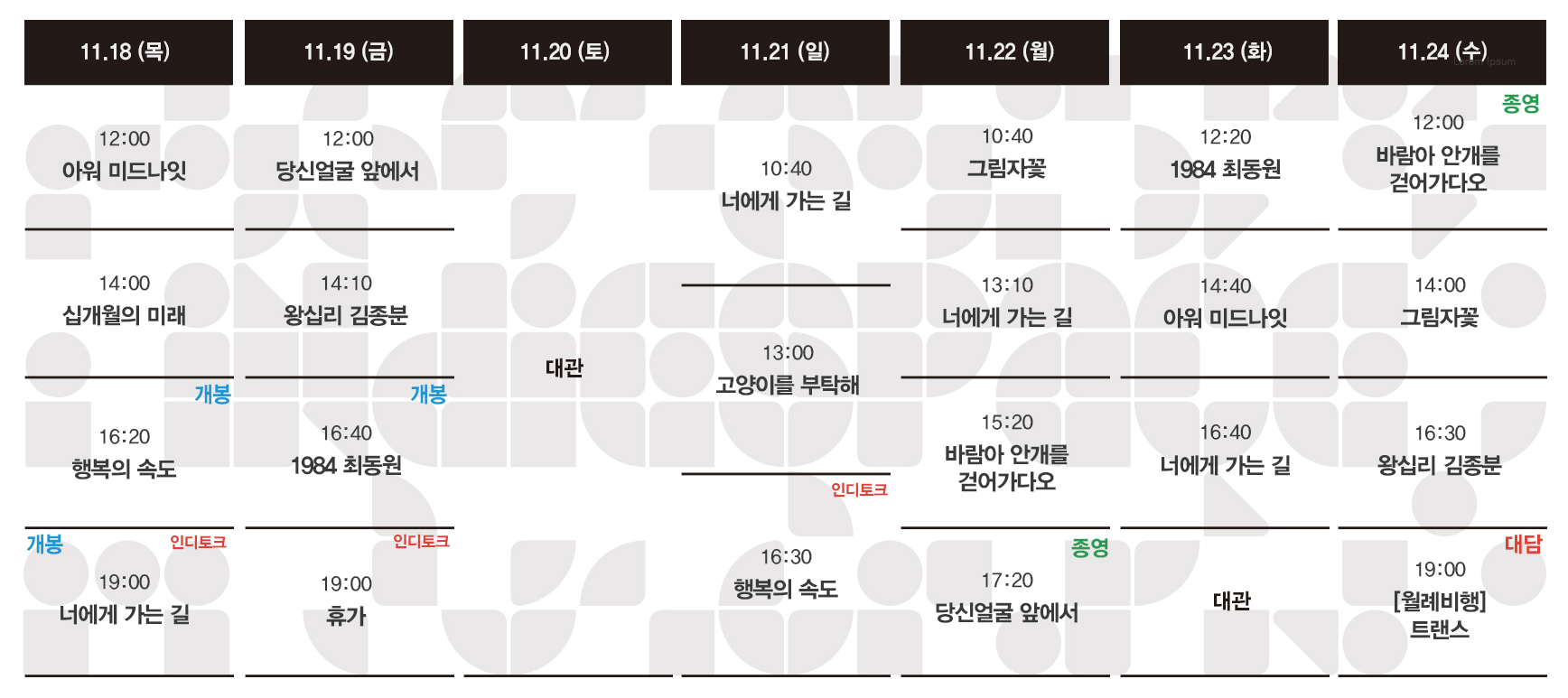 Now Playing/상영시간표 [11.18-11.24 상영시간표] 행복의 속도 / 너에게 가는 길 / 1984 최동원 / 왕십리 김종분 / 아워 미드나잇 / 당신얼굴 앞에서 / 바람아 안개를 걷어가다오 / 그림자꽃 / 휴가 / 십개월의 미래 / 고양이.. by indiespace_은 2021. 11. 15. 예매 예스24 상영작 정보 행복의 속도 너에게 가는 길 1984 최동원 왕십리 김종분 아워 미드나잇 당신얼굴 앞에서 바람아 안개를 걷어가다오 그림자꽃 휴가 십개월의 미래 고양이를 부탁해 공유하기 게시글 관리 인디스페이스 indiespace 저작자표시 (새창열림) 'Now Playing > 상영시간표' 카테고리의 다른 글 [12.02-12.08 상영시간표] 로그 인 벨지움 / 라임크라임 / 로그북 / 행복의 속도 / 너에게 가는 길 / 1984 최동원 / 왕십리 김종분 / 아워 미드나잇 / 휴가 / 십개월의 미래 / 고양이를 부탁해 (0) 2021.11.30 [11.25-12.01 상영시간표] 라임크라임 / 로그북 / 행복의 속도 / 너에게 가는 길 / 1984 최동원 / 왕십리 김종분 / 아워 미드나잇 / 그림자꽃 / 휴가 / 십개월의 미래 / 고양이를 부탁해 (0) 2021.11.19 [11.11-11.17 상영시간표] 왕십리 김종분 / 아워 미드나잇 / 당신얼굴 앞에서 / 바람아 안개를 걷어가다오 / 그림자꽃 / 휴가 / 사상 / 십개월의 미래 / 노회찬6411 / 고양이를 부탁해 (1) 2021.11.04 [11.04-11.10 상영시간표] 당신얼굴 앞에서 / 바람아 안개를 걷어가다오 / 그림자꽃 / 휴가 / 한창나이 선녀님 / 사상 / 십개월의 미래 / 노회찬6411 / 고양이를 부탁해 / 최선의 삶 (0) 2021.10.28 [10.28-11.03 상영시간표] 바람아 안개를 걷어가다오 / 그림자꽃 / 휴가 / 한창나이 선녀님 / 사상 / 십개월의 미래 / 노회찬6411 / 고양이를 부탁해 (0) 2021.10.22 관련글 [12.02-12.08 상영시간표] 로그 인 벨지움 / 라임크라임 / 로그북 / 행복의 속도 / 너에게 가는 길 / 1984 최동원 / 왕십리 김종분 / 아워 미드나잇 / 휴가 / 십개월의 미래 / 고양이를 부탁해 [11.25-12.01 상영시간표] 라임크라임 / 로그북 / 행복의 속도 / 너에게 가는 길 / 1984 최동원 / 왕십리 김종분 / 아워 미드나잇 / 그림자꽃 / 휴가 / 십개월의 미래 / 고양이를 부탁해 [11.11-11.17 상영시간표] 왕십리 김종분 / 아워 미드나잇 / 당신얼굴 앞에서 / 바람아 안개를 걷어가다오 / 그림자꽃 / 휴가 / 사상 / 십개월의 미래 / 노회찬6411 / 고양이를 부탁해 [11.04-11.10 상영시간표] 당신얼굴 앞에서 / 바람아 안개를 걷어가다오 / 그림자꽃 / 휴가 / 한창나이 선녀님 / 사상 / 십개월의 미래 / 노회찬6411 / 고양이를 부탁해 / 최선의 삶 댓글