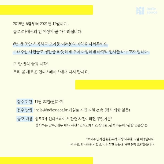 공모 내용: 종로3가 인디스페이스 관련 사진이라면 무엇이든!