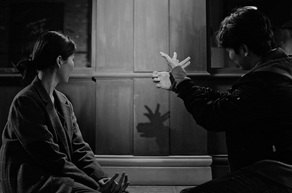 유운성: 네, 질문이 올라와서 여쭤보고 계속 얘기 나누도록 하겠습니다. 좋은 얘기가 써져 있으니까 그대로 다 읽어드리도록 하겠습니다. “예기치 못한 순간에 좋은 영화를 보게 되어 기쁩니다. 영화의 엔딩, 그리고 지하철을 타고 가던 지훈과 은영을 비추던 카메라가 흑백에서 마침내 컬러로 바뀝니다. 지훈과 은영은 잠을 자고 있지만 저는 마치 잠에서 그들이 깨어나는 듯한 느낌을 받았습니다. 흑백에서 컬러로 색이 변하는 연출을 하신 감독님의 의도가 궁금합니다. 그리고 애초에 흑백으로 연출하시려고 했던 이유도 설명해주면 좋겠습니다. 그리고 가능하면 영화에서 많이 등장하는 손 그림자, 코끼리 외에도 두 인물이 일종의 상황극을 할 때 벽에 비치는 그림자가 궁금합니다.”라고 하셨습니다. 먼저 흑백과 컬러, 그 다음에 그림자와 관련된 것을 얘기해주시면 좋을 거 같습니다.