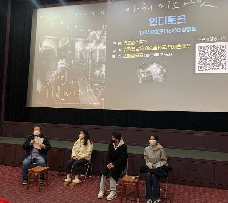 유운성 평론가(이하 유운성): 먼저 오늘 참석해주신 분들 소개해드립니다. 제 옆에 계신 분이 이 영화를 연출하신 임정은 감독님이십니다. 그리고 그 옆에 오늘 보신 영화의 두 주연 배우분들 나와 계신데요. 이승훈 배우님, 그리고 박서은 배우님. 간략히 이 영화에 대해서 소개하고 시작하도록 하겠습니다. 오늘 보신 이 영화는 이 자리에서 보는 게 되게 특별한데, 왜냐하면 영화 속에 이 곳이 나옵니다. 이미 알려져 있지만 이 건물은 곧 운영을 중단하게 되어서 〈아워 미드나잇〉이라고 하는 영화를 서울극장에 자리에 있는 인디스페이스에서 봤다는 것은 나중에도 기억할 만한 사건이 되지 않을까 생각해봅니다. 이 작품은 임정은 감독의 장편 데뷔작입니다. 작년 부산국제영화제 비전 부문에서 처음 상영이 되었고 그로부터 일 년 정도가 지나서 올해 이렇게 개봉해서 관객들과 만나게 되었습니다.