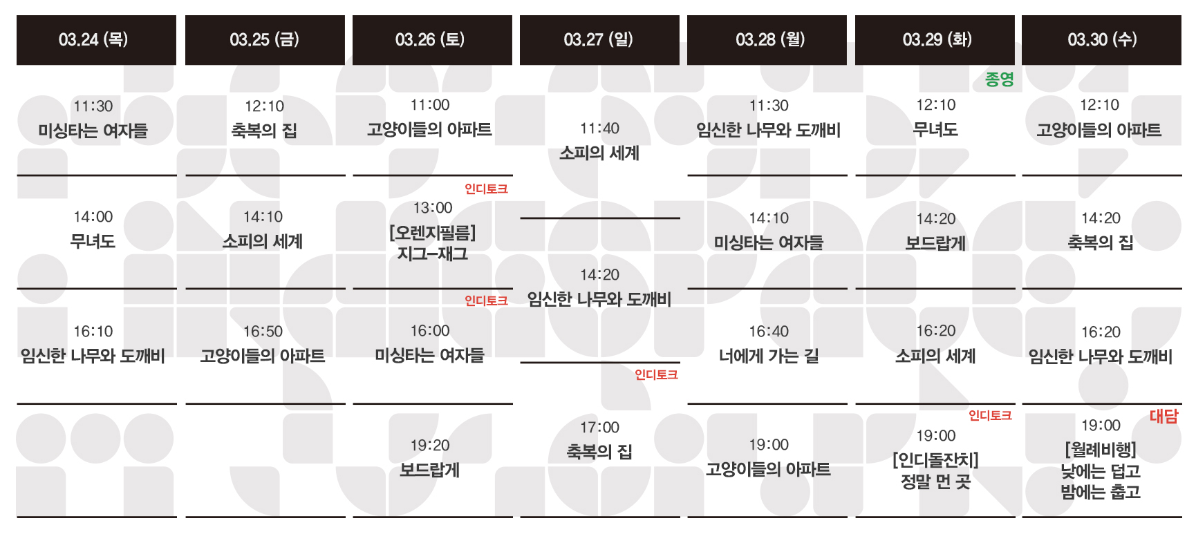 Now Playing/상영시간표 [03.24-03.30 상영시간표] 고양이들의 아파트 / 소피의 세계 / 보드랍게 / 축복의 집 / 임신한 나무와 도깨비 / 미싱타는 여자들 / 무녀도 / 너에게 가는 길 by indiespace_은 2022. 3. 18. [클릭] 공유하기 게시글 관리 인디스페이스 indiespace 저작자표시 (새창열림) 'Now Playing > 상영시간표' 카테고리의 다른 글 [04.07-04.13 상영시간표] 재춘언니 / 고양이들의 아파트 / 소피의 세계 / 보드랍게 / 축복의 집 / 임신한 나무와 도깨비 / 미싱타는 여자들 (0) 2022.04.01 [03.31-04.06 상영시간표] 재춘언니 / 고양이들의 아파트 / 소피의 세계 / 보드랍게 / 축복의 집 / 임신한 나무와 도깨비 / 미싱타는 여자들 / 너에게 가는 길 (0) 2022.03.25 [03.17-03.23 상영시간표] 고양이들의 아파트 / 소피의 세계 / 보드랍게 / 축복의 집 / 임신한 나무와 도깨비 / 미싱타는 여자들 / 무녀도 / 너에게 가는 길 (0) 2022.03.11 [03.10-03.16 상영시간표] 소피의 세계 / 보드랍게 / 축복의 집 / 임신한 나무와 도깨비 / 미싱타는 여자들 / 무녀도 / 너에게 가는 길 (0) 2022.03.03 [03.07-03.13 상영시간표] 소피의 세계 / 보드랍게 / 축복의 집 / 임신한 나무와 도깨비 / 미싱타는 여자들 / 무녀도 / 너에게 가는 길 (0) 2022.03.03 관련글 [04.07-04.13 상영시간표] 재춘언니 / 고양이들의 아파트 / 소피의 세계 / 보드랍게 / 축복의 집 / 임신한 나무와 도깨비 / 미싱타는 여자들 [03.31-04.06 상영시간표] 재춘언니 / 고양이들의 아파트 / 소피의 세계 / 보드랍게 / 축복의 집 / 임신한 나무와 도깨비 / 미싱타는 여자들 / 너에게 가는 길 [03.17-03.23 상영시간표] 고양이들의 아파트 / 소피의 세계 / 보드랍게 / 축복의 집 / 임신한 나무와 도깨비 / 미싱타는 여자들 / 무녀도 / 너에게 가는 길 [03.10-03.16 상영시간표] 소피의 세계 / 보드랍게 / 축복의 집 / 임신한 나무와 도깨비 / 미싱타는 여자들 / 무녀도 / 너에게 가는 길 댓글