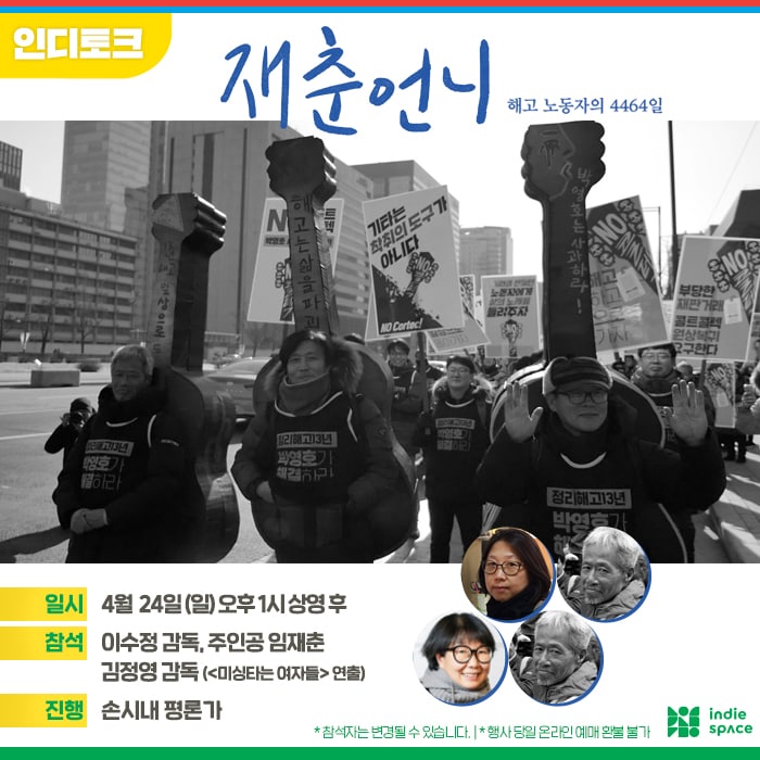 참석: 이수정 감독, 주인공 임재춘, 김정영 감독(<미싱타는 여자들> 연출)
