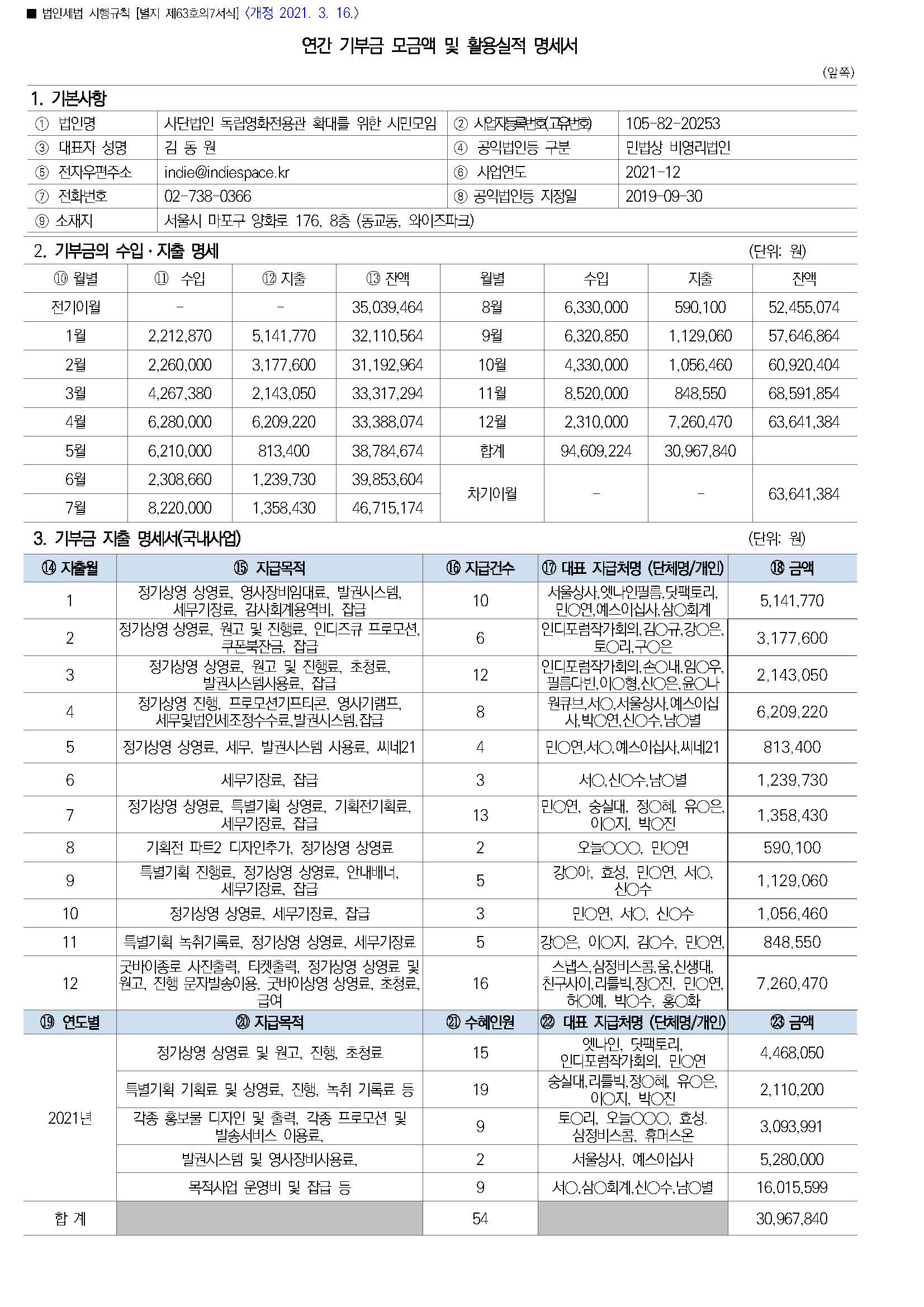 인디스페이스의 2021년 연간 기부금 모금액 및 활용실적 내역입니다.