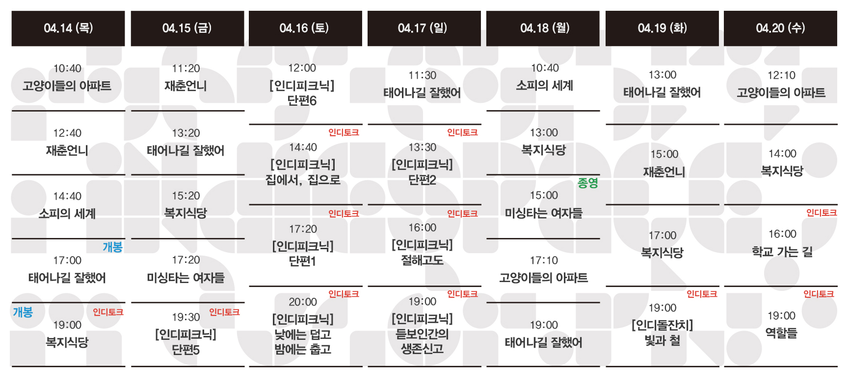 Now Playing/상영시간표 [04.14-04.20 상영시간표] 태어나길 잘했어 / 복지식당 / 재춘언니 / 고양이들의 아파트 / 소피의 세계 / 미싱타는 여자들 / 역할들 by indiespace_은 2022. 4. 7. [클릭] 공유하기 게시글 관리 인디스페이스 indiespace 저작자표시 (새창열림) 'Now Playing > 상영시간표' 카테고리의 다른 글 [04.28-05.04 상영시간표] 평평남녀 / 소설가의 영화 / 헝거 / 위대한 계약: 파주, 책, 도시 / 쓰리: 아직 끝나지 않았다 / 태어나길 잘했어 / 복지식당 / 재춘언니 / 역할들 (0) 2022.04.21 [04.21-04.27 상영시간표] 위대한 계약: 파주, 책, 도시 / 쓰리: 아직 끝나지 않았다 / 태어나길 잘했어 / 복지식당 / 재춘언니 / 고양이들의 아파트 / 소피의 세계 / 역할들 (0) 2022.04.14 [04.07-04.13 상영시간표] 재춘언니 / 고양이들의 아파트 / 소피의 세계 / 보드랍게 / 축복의 집 / 임신한 나무와 도깨비 / 미싱타는 여자들 (0) 2022.04.01 [03.31-04.06 상영시간표] 재춘언니 / 고양이들의 아파트 / 소피의 세계 / 보드랍게 / 축복의 집 / 임신한 나무와 도깨비 / 미싱타는 여자들 / 너에게 가는 길 (0) 2022.03.25 [03.24-03.30 상영시간표] 고양이들의 아파트 / 소피의 세계 / 보드랍게 / 축복의 집 / 임신한 나무와 도깨비 / 미싱타는 여자들 / 무녀도 / 너에게 가는 길 (0) 2022.03.18 관련글 [04.28-05.04 상영시간표] 평평남녀 / 소설가의 영화 / 헝거 / 위대한 계약: 파주, 책, 도시 / 쓰리: 아직 끝나지 않았다 / 태어나길 잘했어 / 복지식당 / 재춘언니 / 역할들 [04.21-04.27 상영시간표] 위대한 계약: 파주, 책, 도시 / 쓰리: 아직 끝나지 않았다 / 태어나길 잘했어 / 복지식당 / 재춘언니 / 고양이들의 아파트 / 소피의 세계 / 역할들 [04.07-04.13 상영시간표] 재춘언니 / 고양이들의 아파트 / 소피의 세계 / 보드랍게 / 축복의 집 / 임신한 나무와 도깨비 / 미싱타는 여자들 [03.31-04.06 상영시간표] 재춘언니 / 고양이들의 아파트 / 소피의 세계 / 보드랍게 / 축복의 집 / 임신한 나무와 도깨비 / 미싱타는 여자들 / 너에게 가는 길 댓글