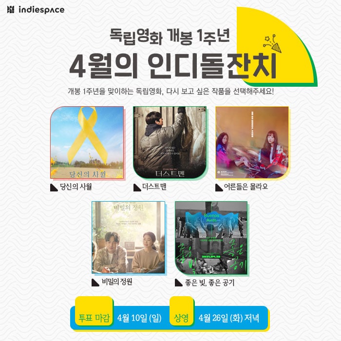 | [인디돌잔치] 2022년 5월 상영작을 선정해주세요 (0) | 2022.05.02 |