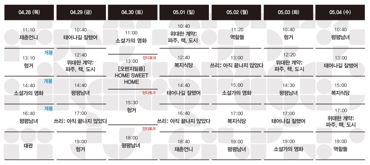[04.28-05.04 상영시간표] 평평남녀 / 소설가의 영화 / 헝거 / 위대한 계약: 파주, 책, 도시 / 쓰리: 아직 끝나지 않았다 / 태어나길 잘했어 / 복지식당 / 재춘언니 / 역할들