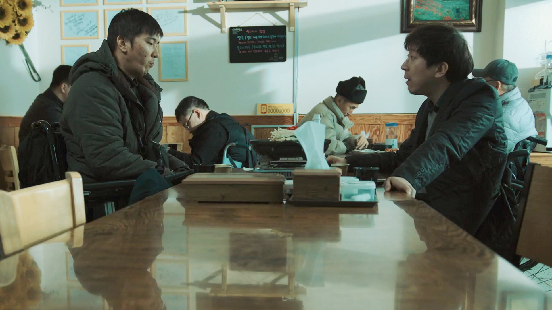 새 출발을 꿈꾸며 장애인 취업 센터를 방문했던 재기는 5급 장애인은 우선 채용 선발 기준에 박탈된다는 사실을 알게 된다. 좌절한 재기의 곁으로 한 남자가 휠체어를 밀며 나타난다. 재기의 사정을 들어주며 공감해주던 남자, ‘고병호(임호준)’는 자신의 일정에 그를 기꺼이 초대한다. 언어장애가 없어도 2급을 소유한 그는 장애인 콜택시를 호출하여 재기와 함께 론볼 경기장으로 매주 향한다. 대신 콜택시 비용은 재기의 몫이다. 론볼 단체 회식 비용 혹은 고병호의 개인 술자리 비용도 재기가 부담해야 한다. 론볼 선수단으로 등록한 뒤 3개월 동안 운동한 기록이 있다면 기업에 운동선수로 취직이 되는 정보와 등급 재조정 행정소송 전문 변호사를 소개해주었기 때문이다. 그것이 고병호가 주장하는 형동생의 의리였다. 이제 돈이 없다던 재기에게 장애인복지대출을 알려주며 강행한다. 급기야 은주에게 받은 두 달치 월세까지 뺏고 소송이 기각되었지만 변호사 선임비를 요구하는 고병호는 우리 사회 속 기득권의 모습을 투영한다.