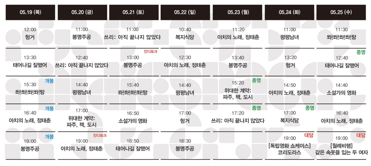Now Playing/상영시간표 [05.19-05.25 상영시간표] 봉명주공 / 아치의 노래, 정태춘 / 쏴!쏴!쏴!쏴!탕 / 평평남녀 / 소설가의 영화 / 헝거 / 위대한 계약: 파주, 책, 도시 / 쓰리: 아직 끝나지 않았다 / 태어나길 잘했어 / 복지.. by indiespace_은 2022. 5. 12. [클릭] 공유하기 게시글 관리 인디스페이스 indiespace 저작자표시 (새창열림) 'Now Playing > 상영시간표' 카테고리의 다른 글 [06.02-06.08 상영시간표] 괴물, 유령, 자유인 / 오마주 / 그대가 조국 / 봉명주공 / 아치의 노래, 정태춘 / 쏴!쏴!쏴!쏴!탕 (0) 2022.05.27 [05.26-06.01 상영시간표] 오마주 / 그대가 조국 / 봉명주공 / 아치의 노래, 정태춘 / 쏴!쏴!쏴!쏴!탕 / 평평남녀 / 소설가의 영화 / 헝거 / 태어나길 잘했어 (0) 2022.05.20 [05.12-05.18 상영시간표] 평평남녀 / 소설가의 영화 / 헝거 / 위대한 계약: 파주, 책, 도시 / 쓰리: 아직 끝나지 않았다 / 태어나길 잘했어 / 복지식당 / 재춘언니 / 역할들 (0) 2022.05.09 [05.05-05.11 상영시간표] 평평남녀 / 소설가의 영화 / 헝거 / 위대한 계약: 파주, 책, 도시 / 쓰리: 아직 끝나지 않았다 / 태어나길 잘했어 / 복지식당 / 재춘언니 / 역할들 (0) 2022.04.28 [04.28-05.04 상영시간표] 평평남녀 / 소설가의 영화 / 헝거 / 위대한 계약: 파주, 책, 도시 / 쓰리: 아직 끝나지 않았다 / 태어나길 잘했어 / 복지식당 / 재춘언니 / 역할들 (0) 2022.04.21 관련글 [06.02-06.08 상영시간표] 괴물, 유령, 자유인 / 오마주 / 그대가 조국 / 봉명주공 / 아치의 노래, 정태춘 / 쏴!쏴!쏴!쏴!탕 [05.26-06.01 상영시간표] 오마주 / 그대가 조국 / 봉명주공 / 아치의 노래, 정태춘 / 쏴!쏴!쏴!쏴!탕 / 평평남녀 / 소설가의 영화 / 헝거 / 태어나길 잘했어 [05.12-05.18 상영시간표] 평평남녀 / 소설가의 영화 / 헝거 / 위대한 계약: 파주, 책, 도시 / 쓰리: 아직 끝나지 않았다 / 태어나길 잘했어 / 복지식당 / 재춘언니 / 역할들 [05.05-05.11 상영시간표] 평평남녀 / 소설가의 영화 / 헝거 / 위대한 계약: 파주, 책, 도시 / 쓰리: 아직 끝나지 않았다 / 태어나길 잘했어 / 복지식당 / 재춘언니 / 역할들 댓글