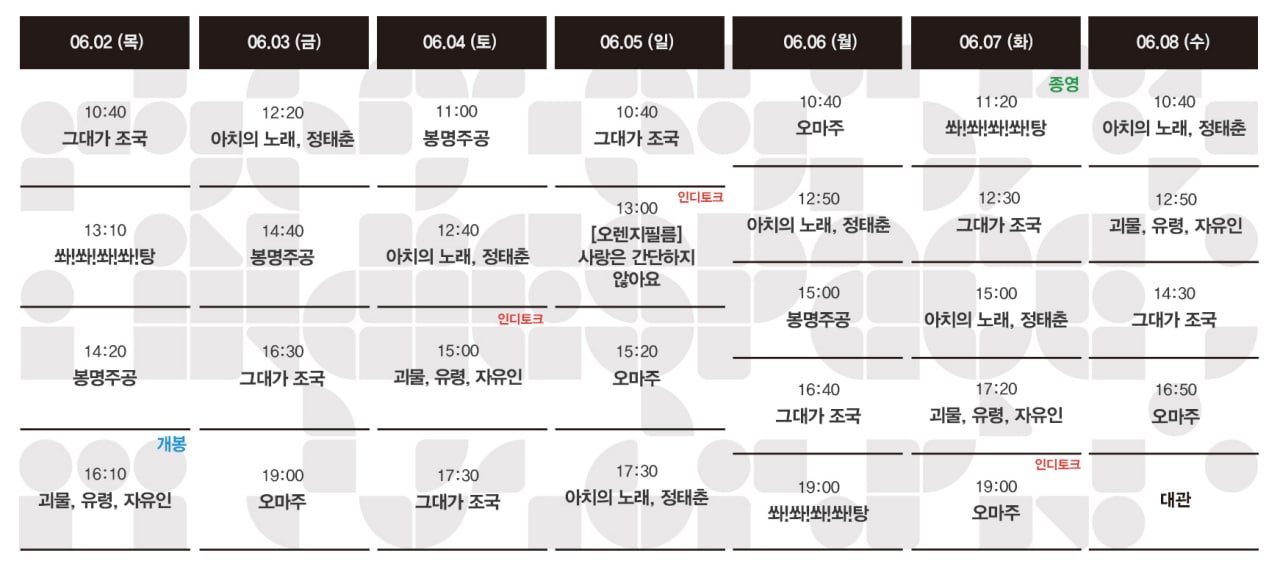 Now Playing/상영시간표 [06.02-06.08 상영시간표] 괴물, 유령, 자유인 / 오마주 / 그대가 조국 / 봉명주공 / 아치의 노래, 정태춘 / 쏴!쏴!쏴!쏴!탕 by indiespace_은 2022. 5. 27. [클릭] 공유하기 게시글 관리 인디스페이스 indiespace 저작자표시 (새창열림) 'Now Playing > 상영시간표' 카테고리의 다른 글 [06.16-06.22 상영시간표] 경아의 딸 / 윤시내가 사라졌다 / 괴물, 유령, 자유인 / 오마주 / 그대가 조국 / 봉명주공 / 아치의 노래, 정태춘 (0) 2022.06.09 [06.09-06.15 상영시간표] 윤시내가 사라졌다 / 괴물, 유령, 자유인 / 오마주 / 그대가 조국 / 봉명주공 / 아치의 노래, 정태춘 (0) 2022.06.03 [05.26-06.01 상영시간표] 오마주 / 그대가 조국 / 봉명주공 / 아치의 노래, 정태춘 / 쏴!쏴!쏴!쏴!탕 / 평평남녀 / 소설가의 영화 / 헝거 / 태어나길 잘했어 (0) 2022.05.20 [05.19-05.25 상영시간표] 봉명주공 / 아치의 노래, 정태춘 / 쏴!쏴!쏴!쏴!탕 / 평평남녀 / 소설가의 영화 / 헝거 / 위대한 계약: 파주, 책, 도시 / 쓰리: 아직 끝나지 않았다 / 태어나길 잘했어 / 복지.. (0) 2022.05.12 [05.12-05.18 상영시간표] 평평남녀 / 소설가의 영화 / 헝거 / 위대한 계약: 파주, 책, 도시 / 쓰리: 아직 끝나지 않았다 / 태어나길 잘했어 / 복지식당 / 재춘언니 / 역할들 (0) 2022.05.09 관련글 [06.16-06.22 상영시간표] 경아의 딸 / 윤시내가 사라졌다 / 괴물, 유령, 자유인 / 오마주 / 그대가 조국 / 봉명주공 / 아치의 노래, 정태춘 [06.09-06.15 상영시간표] 윤시내가 사라졌다 / 괴물, 유령, 자유인 / 오마주 / 그대가 조국 / 봉명주공 / 아치의 노래, 정태춘 [05.26-06.01 상영시간표] 오마주 / 그대가 조국 / 봉명주공 / 아치의 노래, 정태춘 / 쏴!쏴!쏴!쏴!탕 / 평평남녀 / 소설가의 영화 / 헝거 / 태어나길 잘했어 [05.19-05.25 상영시간표] 봉명주공 / 아치의 노래, 정태춘 / 쏴!쏴!쏴!쏴!탕 / 평평남녀 / 소설가의 영화 / 헝거 / 위대한 계약: 파주, 책, 도시 / 쓰리: 아직 끝나지 않았다 / 태어나길 잘했어 / 복지.. 댓글